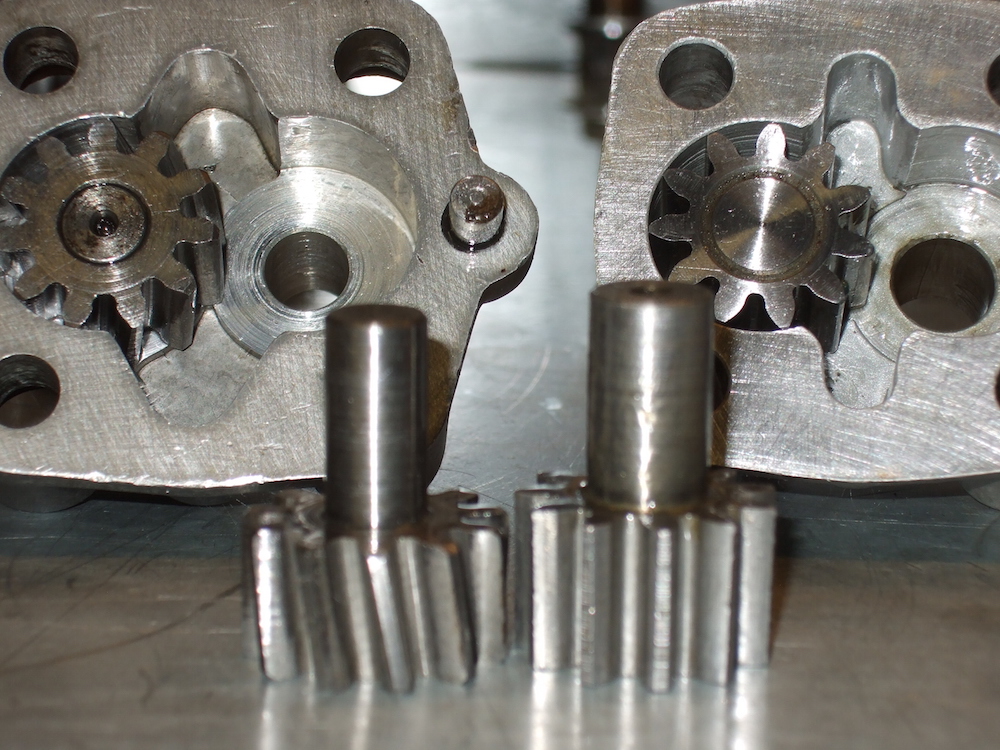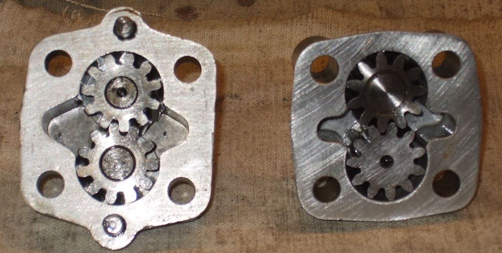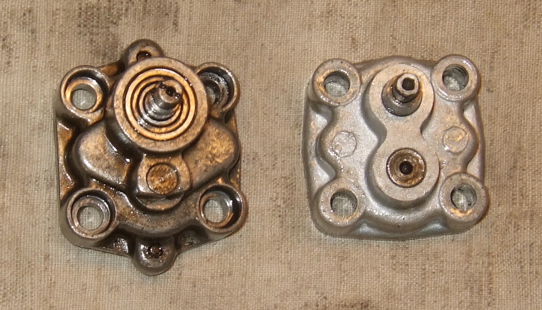 de 1973, et plus précisément du N° 58532, la distribution par pignons, héritée de la V7 Spécial, sera remplacée par une distribution par chaîne. Je viens de faire l’expérience : ce n’est pas exact. Ce qui change est non seulement le type de distribution, mais aussi la fonderie du bloc suite à un changement de pompe à huile. Ancien modèle de pompe, adaptée aux pignons Nouveau modèle de pompe, adaptée à la chaîne |