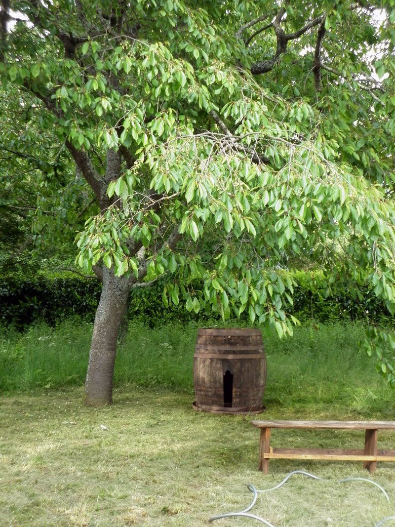 En prévision de futurs apéros, un tonneau a trouvé sa place à l’ombre du cerisier. |