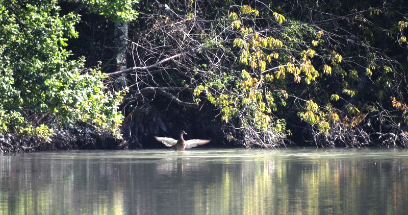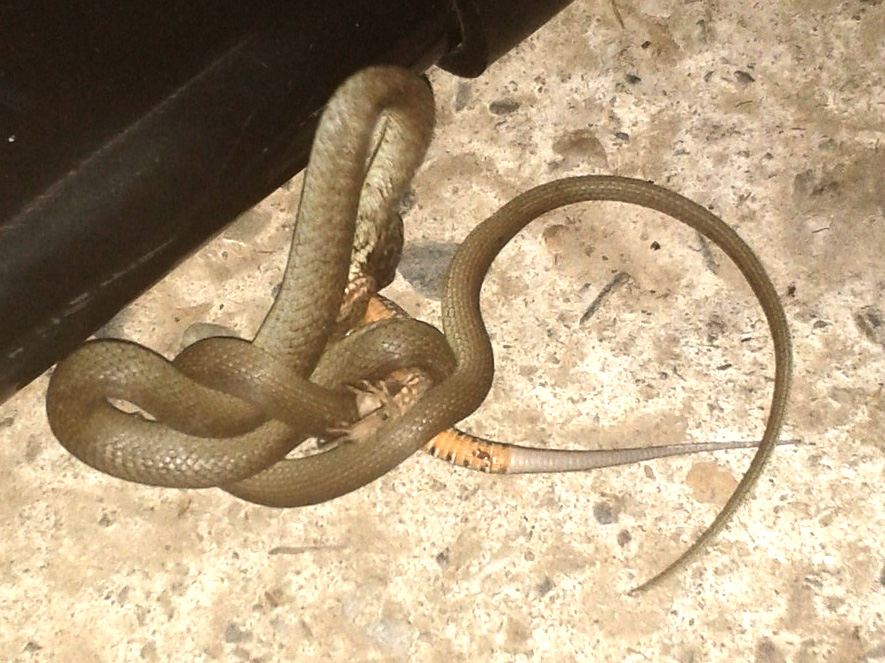 | Au cours du dîner, un «plaf» se fait entendre. Quelque chose est tombée du plafond du hangar! Il s’agit d’une couleuvre occupée à avaler paisiblement son cousin lézard. Ils ont dû glisser de la poutre et la couleuvre, dépourvue de pattes, n’a pu se rattraper. Sans doute perturbée par le flash, la couleuvre relâche son repas qui s’enfuit à toutes pattes ! |