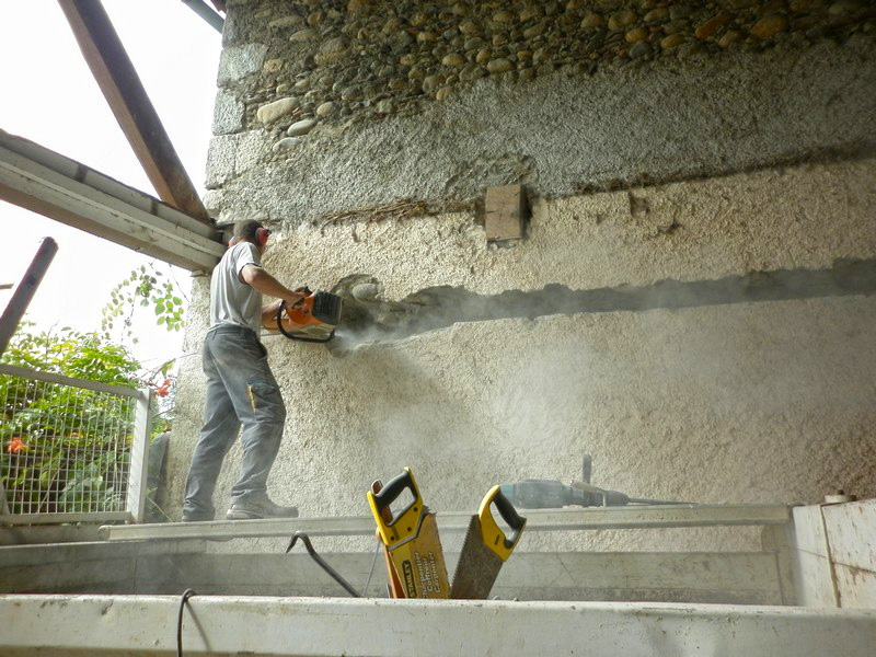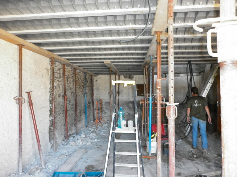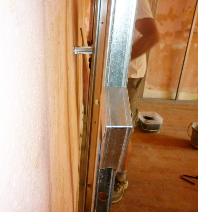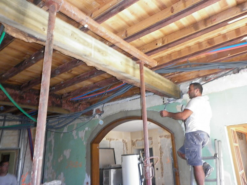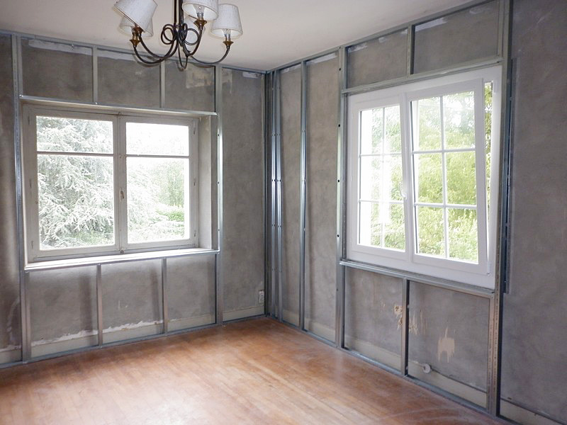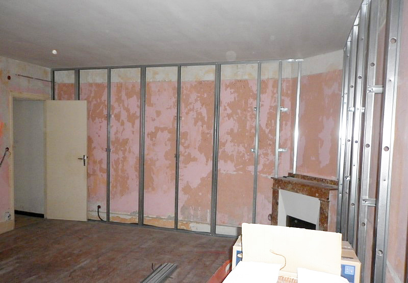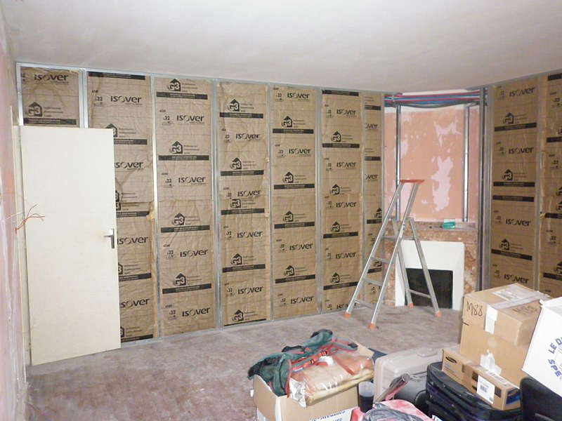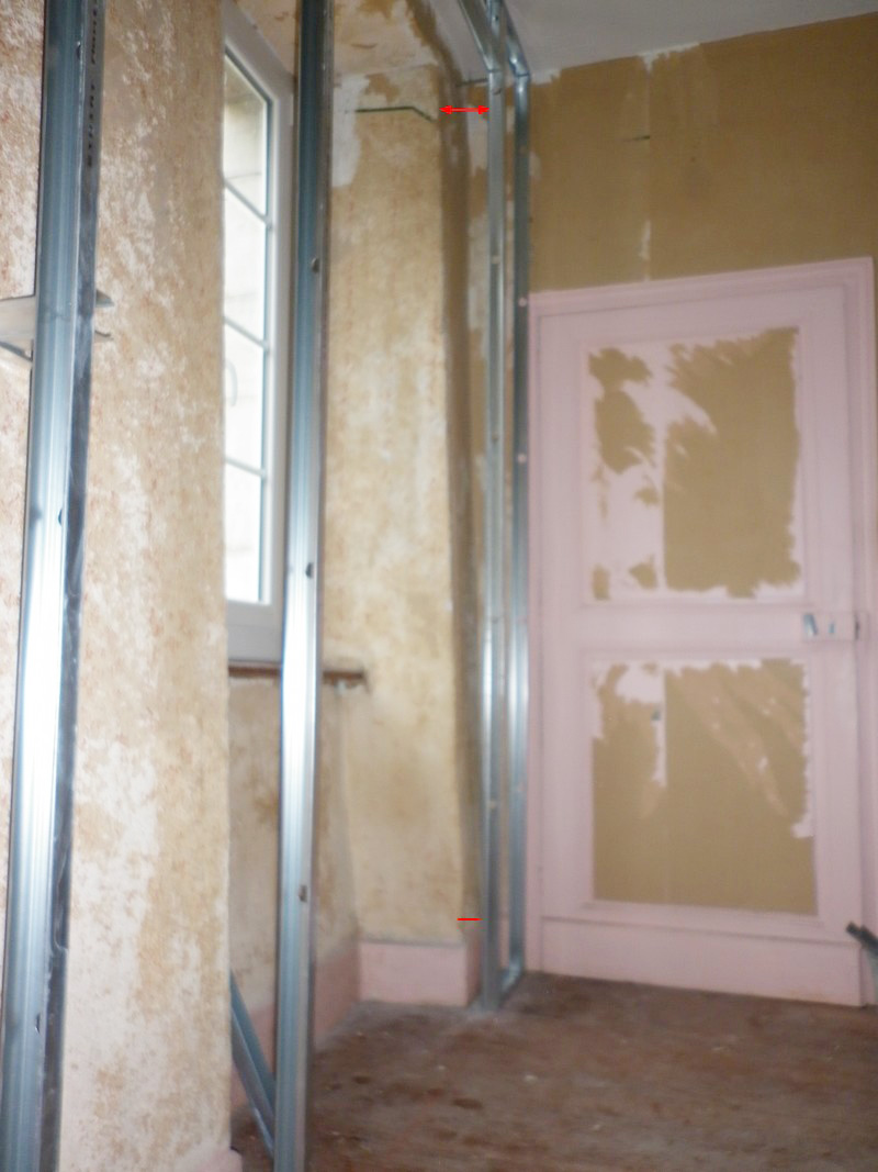 | Les rails-supports des plaques isolantes sont posés. Notez la verticalité des murs, construits bien avant l’invention du fil à plomb. |