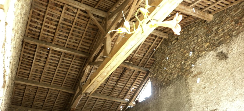 | Patrice m’apprend que cela s’appelle «moiser». Le truc bizzarre, c’est une fleur du massif au pied du mur. Rien à voir avec la poutre, mais ça fait joli. |