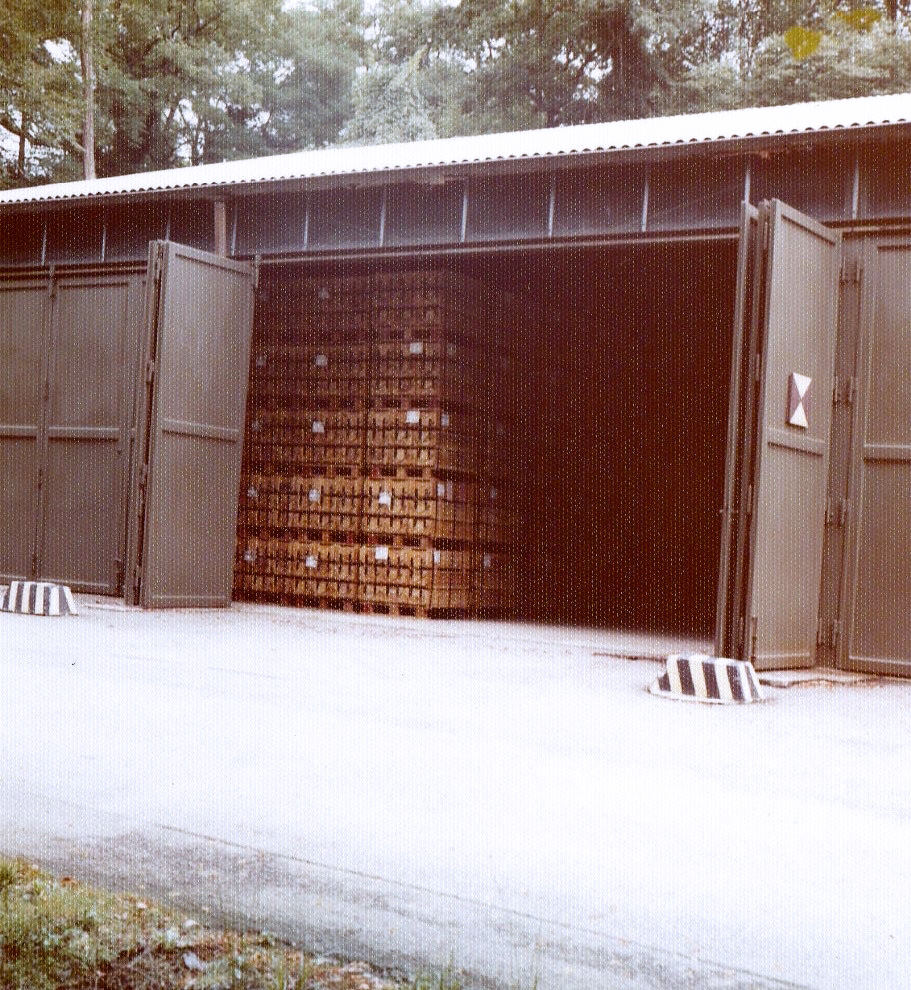 | Toujours vers 72-73, à la 730e Compagnie de Munitions. À cette époque, nous avions un ennemi bien tangible. Il s’agissait bien sûr des troupes du Pacte de Varsovie, massées derrière le rideau de fer. Nous avions donc les yeux fixés vers l’Est et non plus sur la ligne bleue des Vosges comme nos aînés. Jeune artificier breveté, j’étais “Chef de secteur” au dépôt d’armée 59, à Kenzingen. Ici, le magasin C4, 400 m2, 18.000 coups de 105mm. |