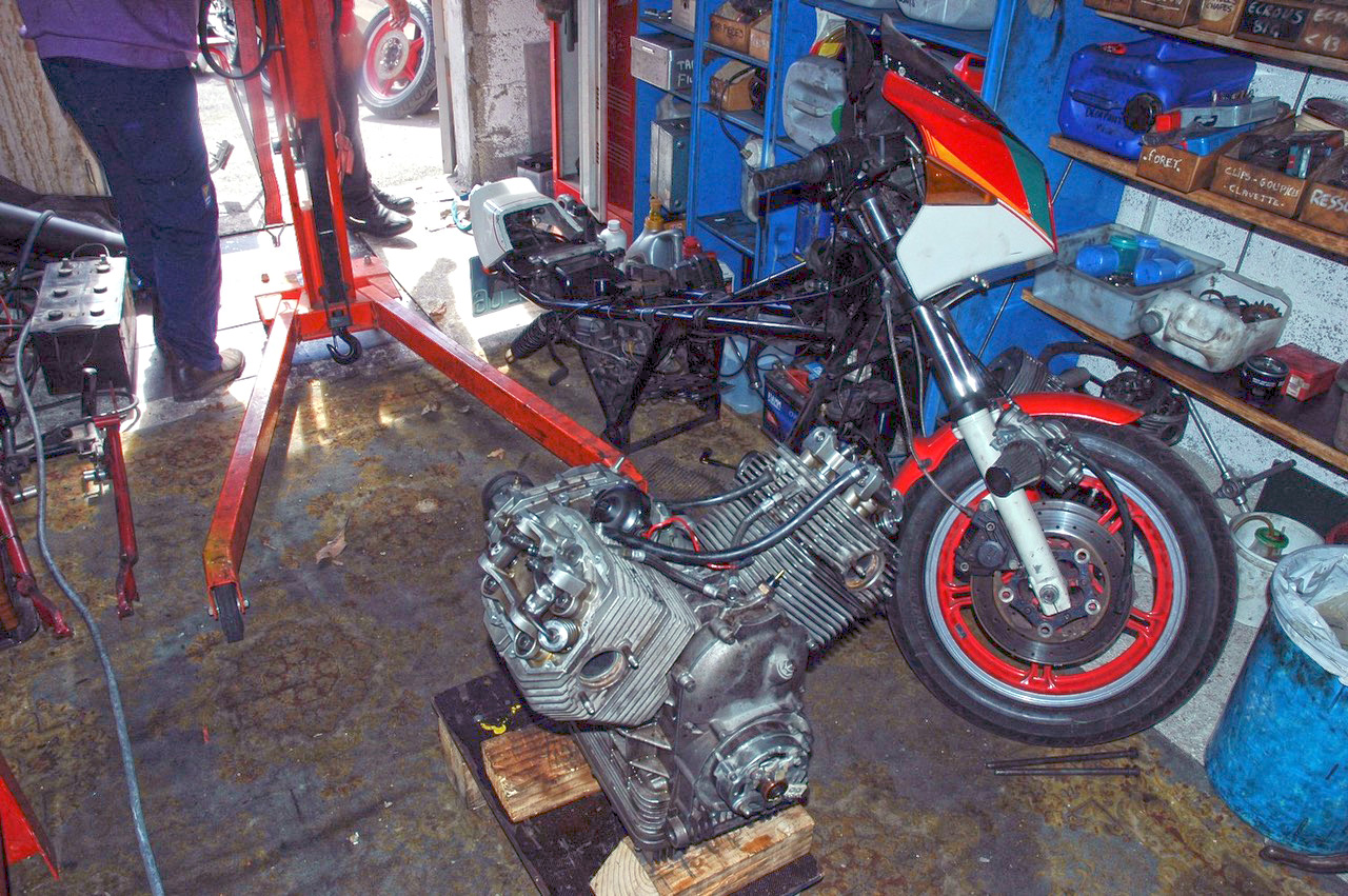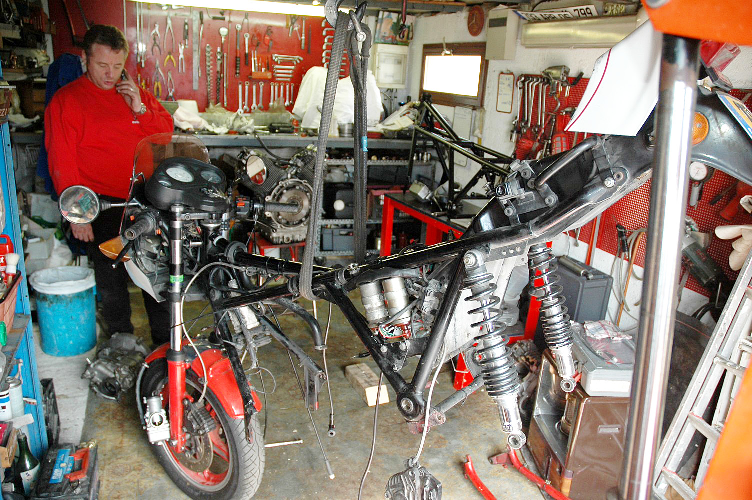 | Une heure et demi après, le moteur est posé sur un tabouret, le cadre est pendu à la