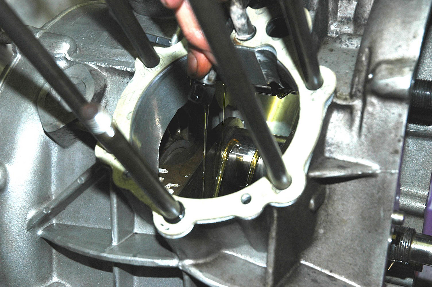 serrage. Comment vérifier que l’huile passe bien dans les bons passages ? La Tavola’s Family va nous donner un conseil d’une simplicité exemplaire : mettre un peu d’huile dans le fond du carter et faire tourner la pompe à huile avec un tournevis électrique (sens inverse des aiguilles d’une montre). Le spectacle est fascinant : le vilo est en place ainsi que l’arbre à came et on voit les jets d’huile sortir des paliers. Ce jeu d’huile, c’est magique ! |