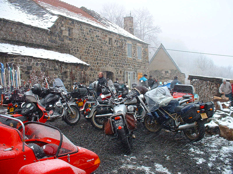 bien écrit “minable”) pour arriver à la ferme. Arrivée ferme de la Rajasse, il fait frais. Voulant nous éblouir, Miche du Sud, sur sa puissante LM, oublie de sortir le genou dans un droit et arrache un cligno sur le vibreur. Bien contents de béquiller, une bière bien fraîche nous est offerte. |