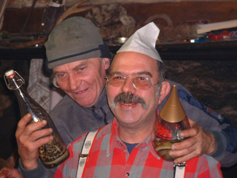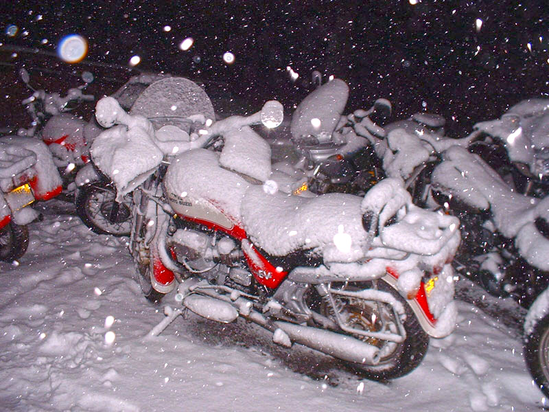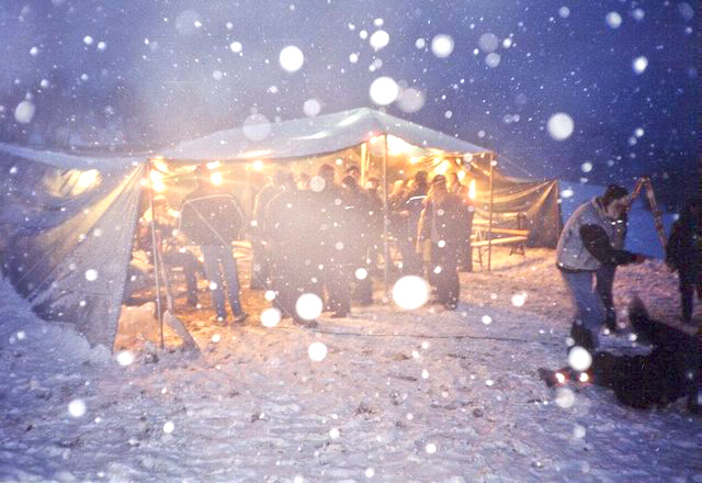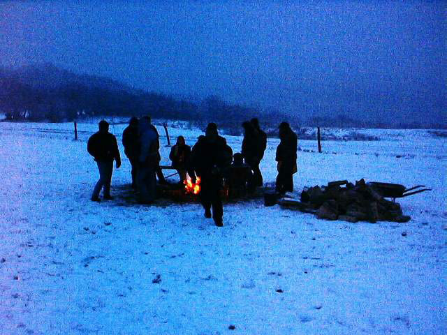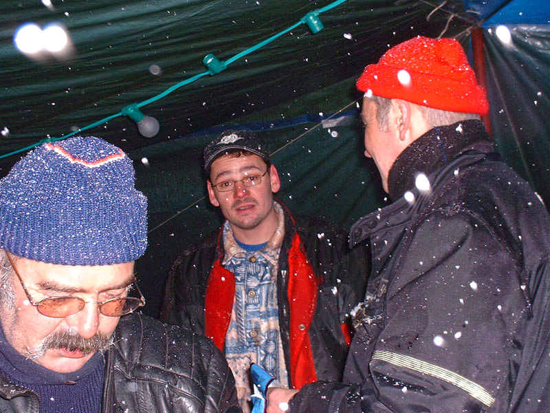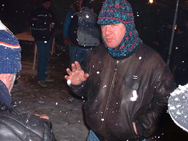 déjà là, le comité d’organisation remet des bières au frais. Le Scal, en avance, n’arrive qu’une heure après nous. À l’apéro avec le Scal et Nanard, tandis que voltigent les flocons. |