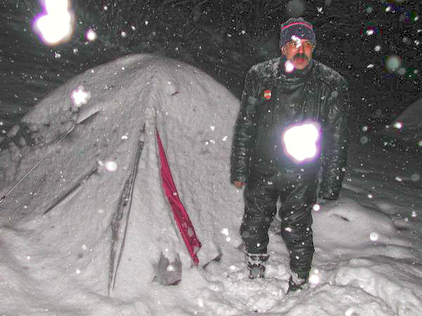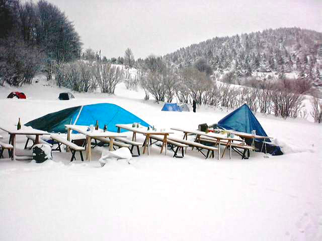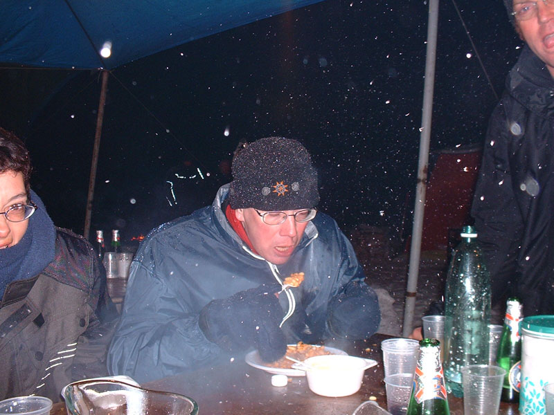 | Les discussions vont bon train : - T’attaquais, toi? - N’est-il pas dangereux de circuler sur une béquille à roulette russe? - Comment t’as fait fondre le pastis, toi ? Stéphane, notre mâle osselet, doit se lever fréquemment pour faire tomber la neige du toit qui se rapproche de nous, tandis que les petits restent assis bien au frais. L’efficace Andrea déplie son matériel de chauffage et les sacs de blé sont réchauffés au camping-gaz dans une marmite militaire. Les petits sacs seront distribués aux convives qui en pleurent de reconnaissance. La soupe arrive, elle est bonne et chaude (je craignais une soupe glacée mexicaine) puis les haricots au mouton qui vont participer un peu plus à l’élargissement du trou de la couche d’ozone et au chauffage des duvets par air pulsé. Miche du Sud garde ses gants pour manger... |