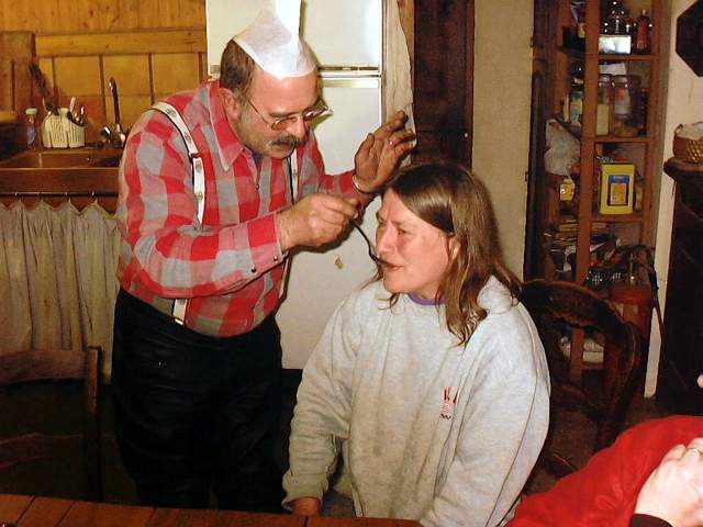 | Une fois la coiffe de Sainte-Mélitta en place sur le bonnet, la cérémonie des Sucres