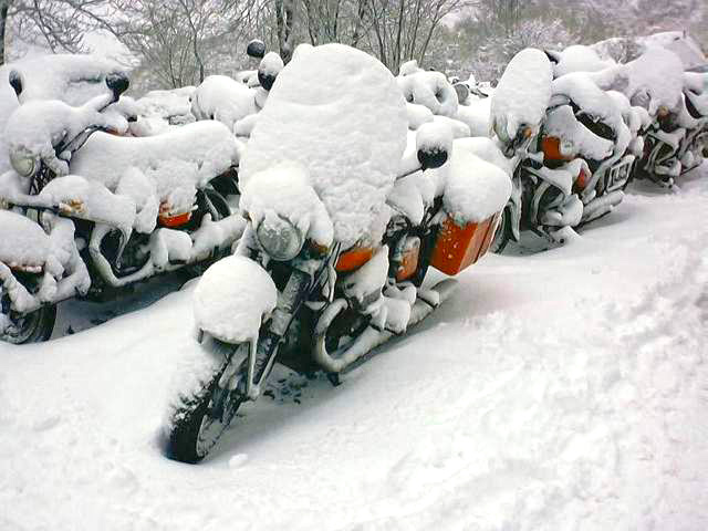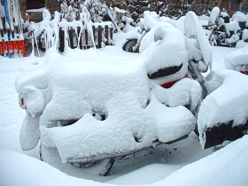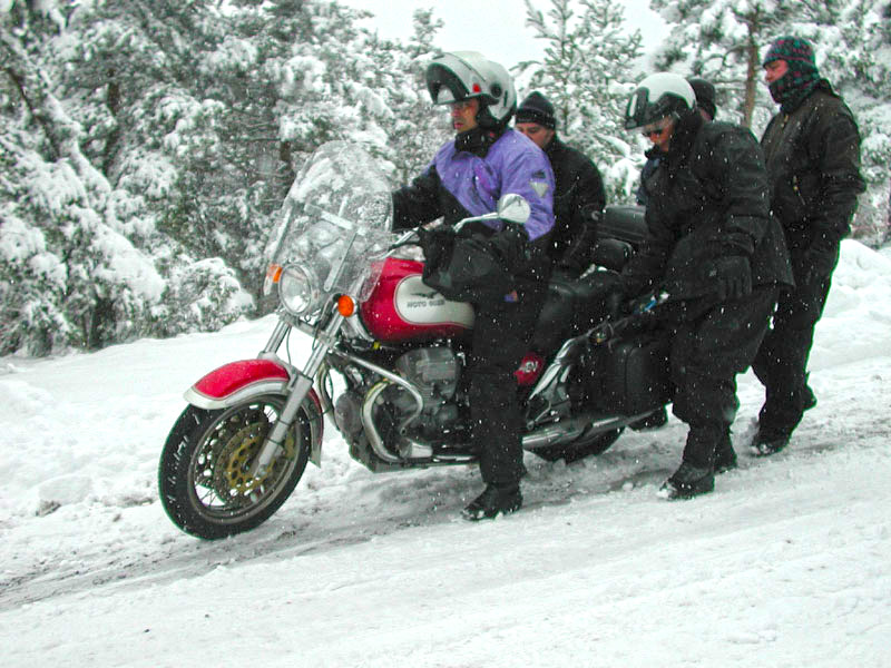en position (merci, Miche). Puis, dans un élan de solidarité digne d’un orignal, nous décidons de faire le chemin par étapes, un sur la moto et 2 ou 3 l’accompagnant en maintenant le gracieux équipage. On béquille 100m plus loin et on revient pour le prochain. Qui a dit qu’il faisait froid? Voici Tom et ses stabilisateurs bénévoles. |