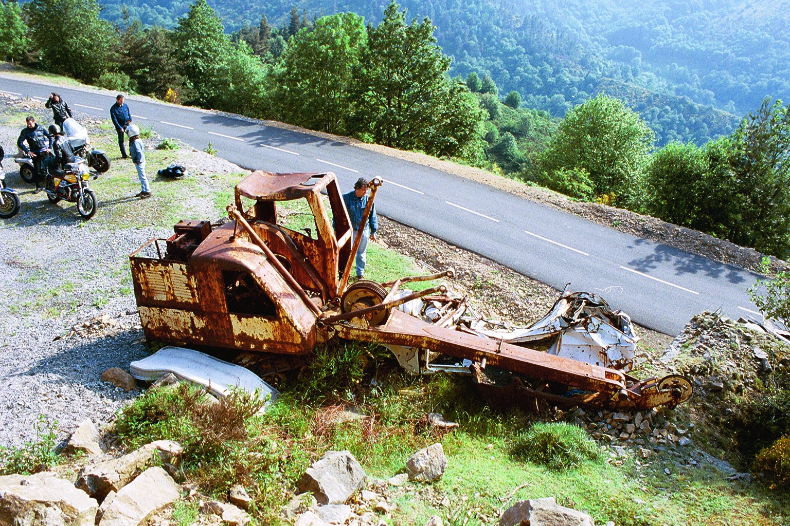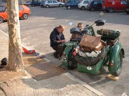 | RV à Tournon pour attendre MCT et Manue, sur twin 2T Yam 350 de ’72. Nous partons en avance pour ne pas ralentir le groupe. La montée du col nous permet d’admirer le paysage, l’allumage venant de se dérégler. C’était la came qui actionne le rupteur qui tournait dans le vilo. Elle n’est même pas clavetée !! Quelques pannes insignifiantes plus tard, nous nous garons sur la place de Lamastre pour un rapide sandwich et une séance de mécanique échange bougies-condensateur-réglage d’avance. C’est reparti. Quand elle tourne bien, c’est du vrai bonheur, mais ça ne dure pas : à la montée d’un col, MCT me rattrape et me fait stopper : la roue AR se déhanche méchamment, 6 rayons sont cassés. Comme j’ai une roue de secours, échange et c’est reparti jusqu’à la prochaine.. |