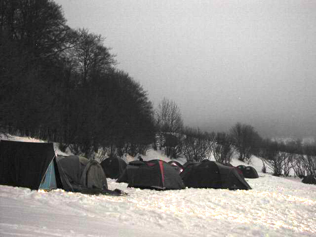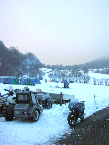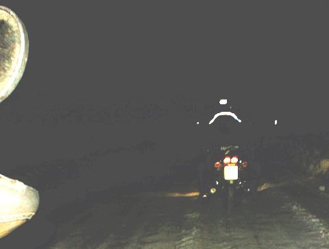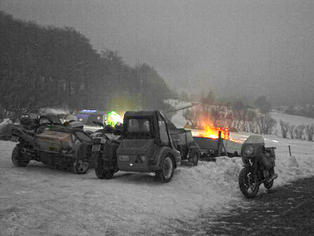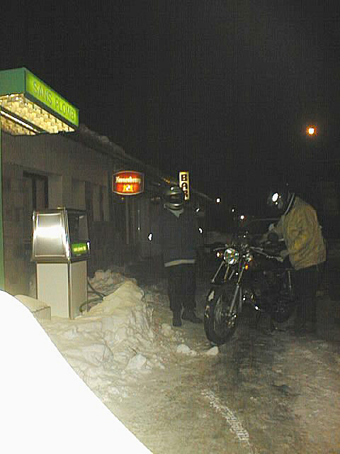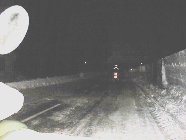 | Peu après, un panneau lumineux nous indique qu’il fait -6°. La route devient verglacée méchant entre les congères de plus en plus longues et hautes. Le Pâât roule devant pour m’éclairer ; c’est la seule fois que j’aurais pu rouler plus vite que les motos, mais qu’est ce qu’il fait froid. Andrea s’est emmaillotée dans ses couvertures. |