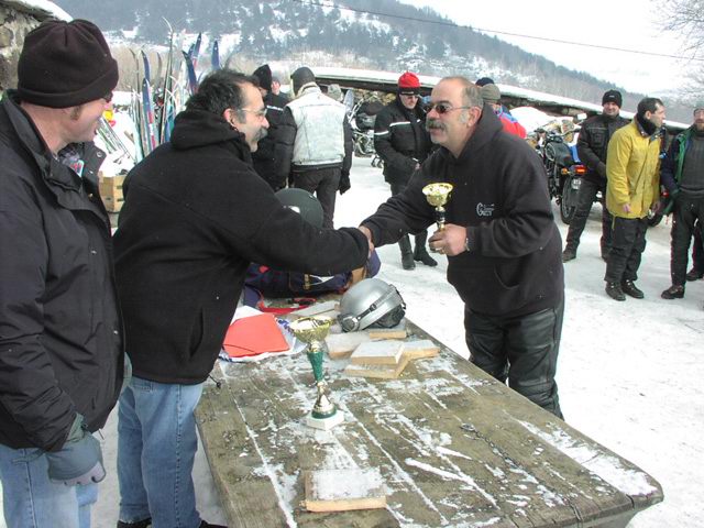 | Distribution des prix au soleil. Un Gardois me souffle la coupe de la plus ancienne : il s’est inscrit l’avant-veille et est venu en Motosacoche de ... 1938 ! Ard’twin fait bien les choses et me décerne la coupe de la malchance. |