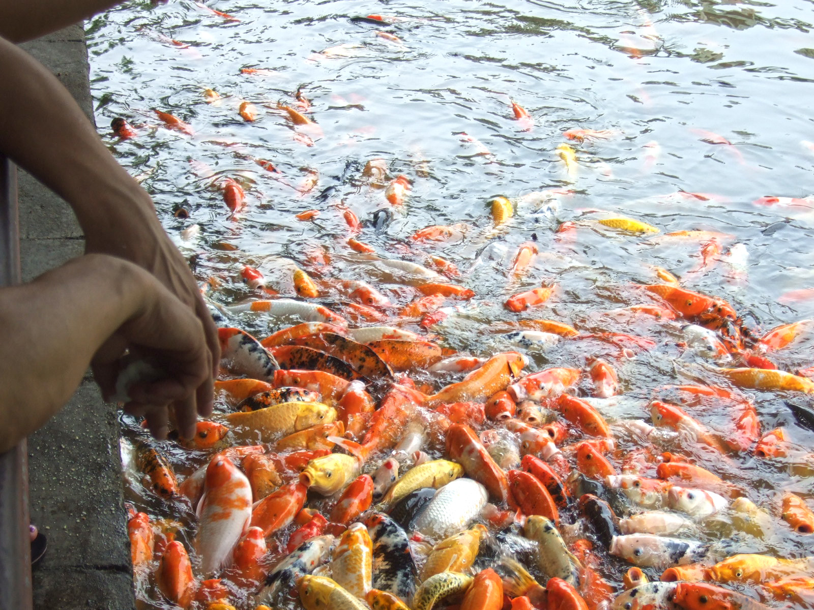 | Pour terminer, quelques carpes koï, affamées, qui pullulent dans le plan d’eau d’un