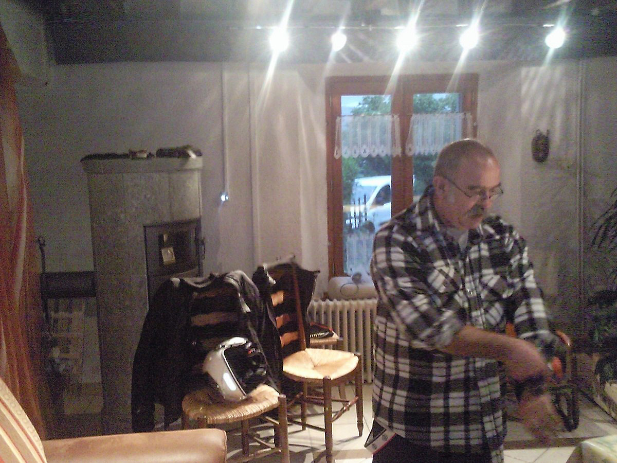 | Arrivons à Laffrey vers 18h. Je suis trempé, frigorifié. Véro me prête un T-shirt et une chemise genre bûcheron canadien : je revis et rejoins Rémi et Jacky, qui ont quasiment trouvé la panne. La cellule redresseuse et le régulateur sont morts, plus un fil en court-circuit. Puis Véro nous sert un repas divin (pas mangé ce midi). |