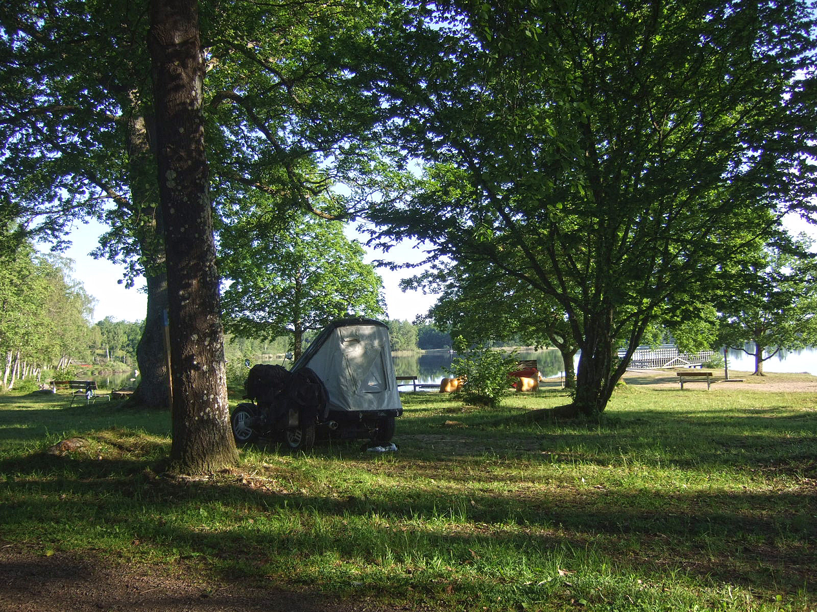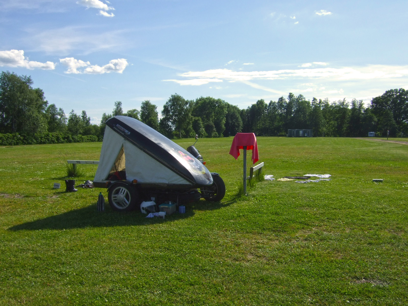 Malmoe et de continuer au nord. Le ciel est ’achement noir, l’orage menace et tient parole ! Trombes d’eau. J’ai l’impression que l’orage me suit, puis éclaircie, je suis à Hassleholm avec des ronds sur le A et ailleurs, un panneau « camping » et bingo ! Suis trop fatigué pour continuer : je me pose avec délicatesse. |