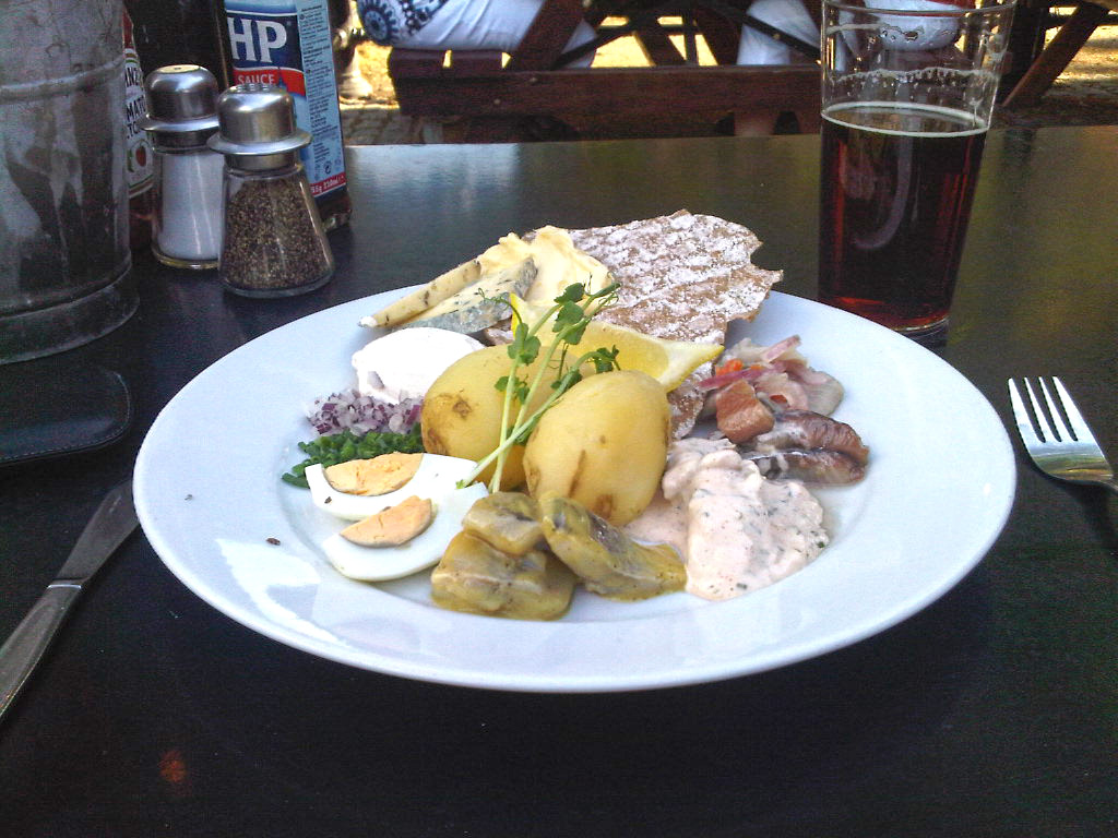 à toute heure, je l’ai constaté cet après-midi car nombreuses sont les terrasses). Je me suis fait une assiette de 4 poissons, accompagnés de pommes de terre nouvelles, une sauce au fromage blanc, ciboulette et oignons, un régal ! Y avait aussi de la sauce HP, que j’ai boudée (pardon Jacquot). La bouffe n’est pas horriblement chère : l’assiette a coûté environ 9,50 € mais les 2 bières pour faire glisser : 12,40 € ! |