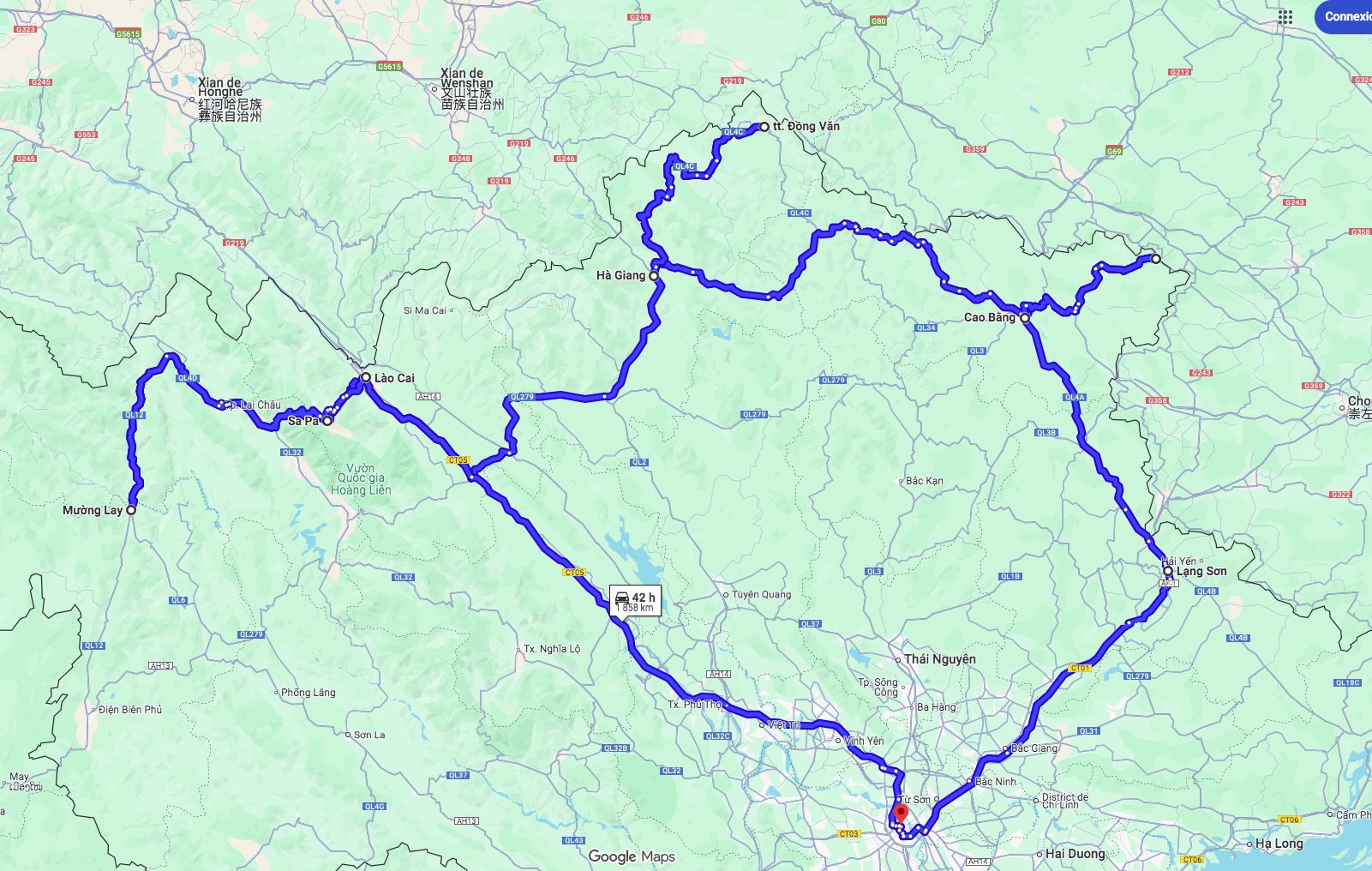 | L’itinéraire. Selon Google maps : 1.858 km et 41 heures, soit la modique somme de 45,317 km/h. |
