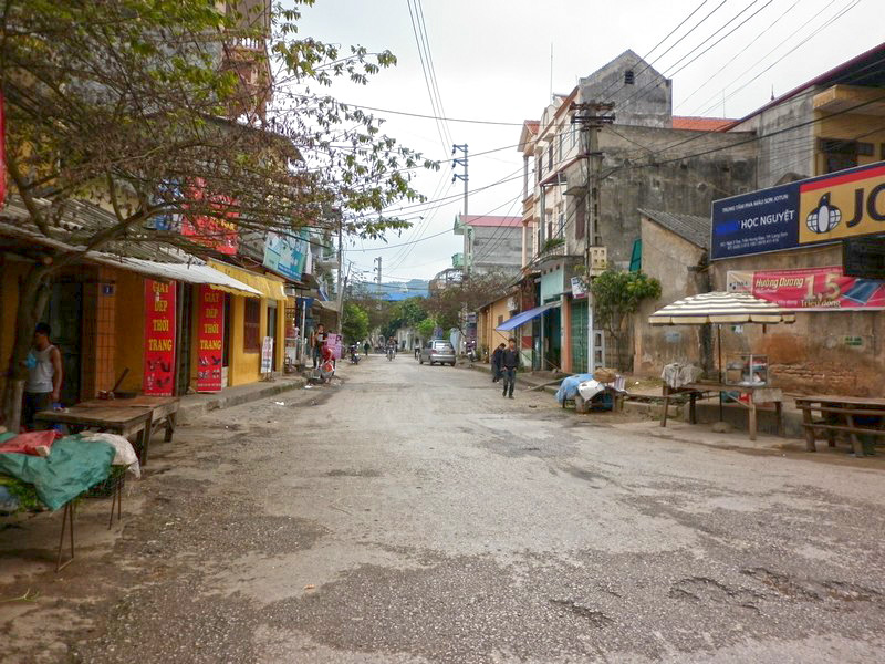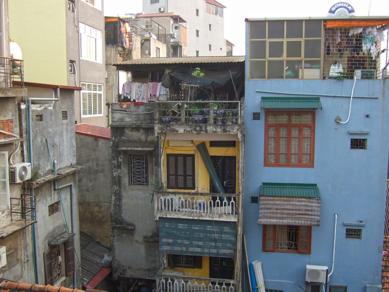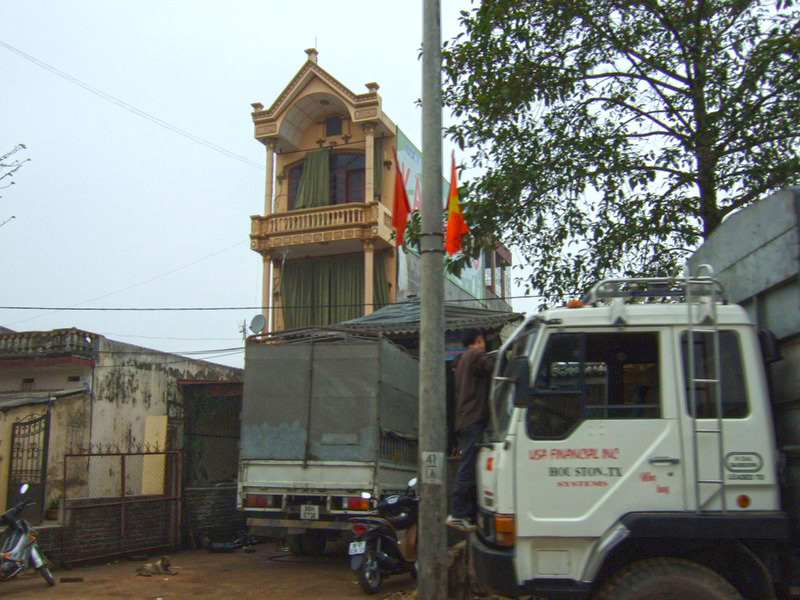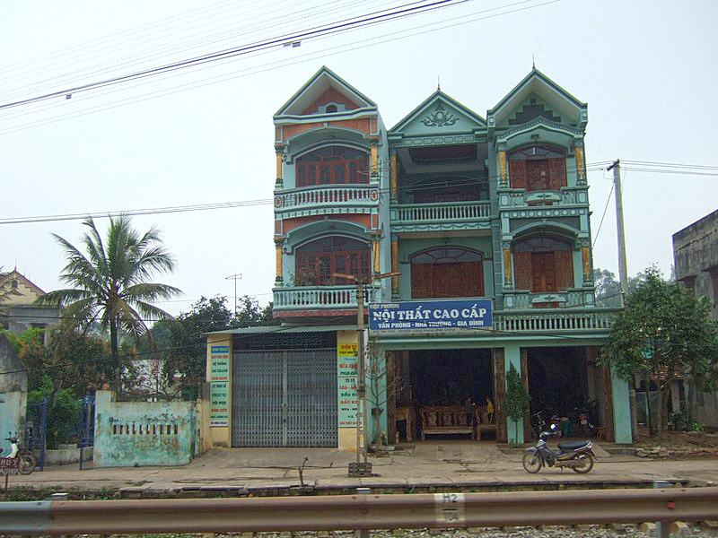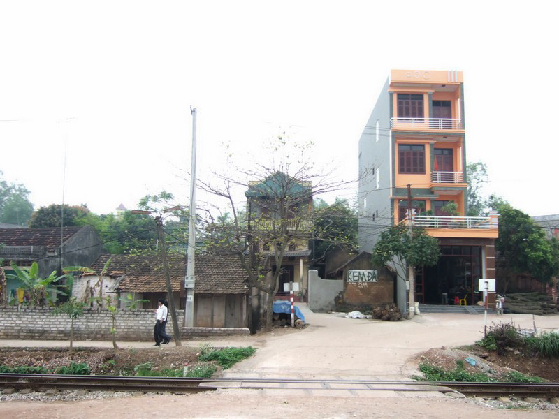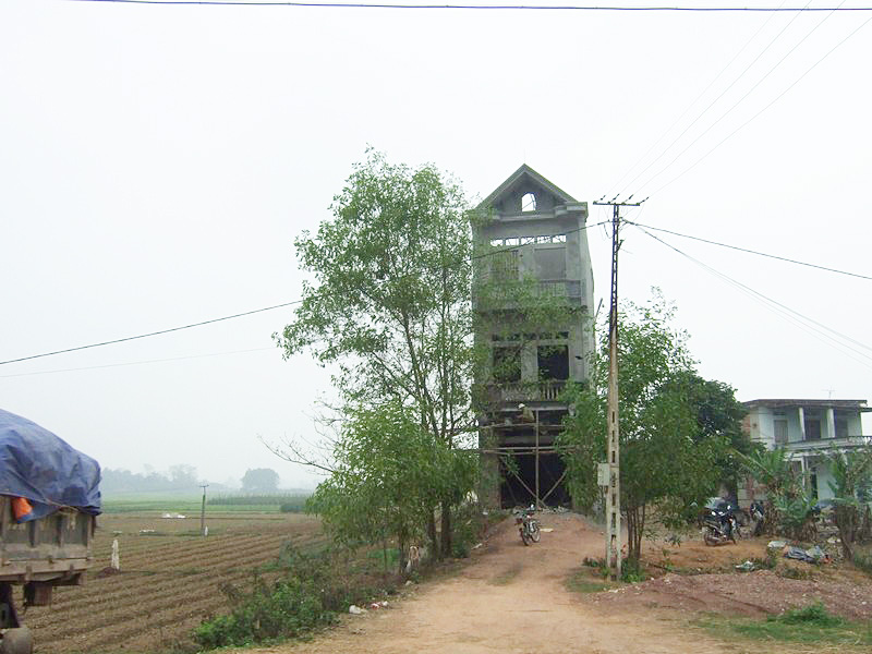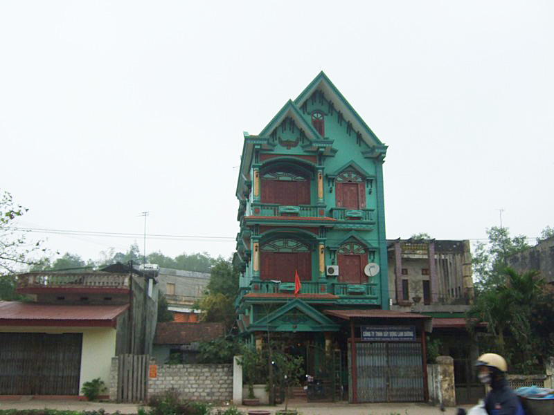 | Nam est à l’heure, nos valises embarquent dans le bon véhicule, sortons de Hanoï. La route est large et belle, faisons quelques photos de ces maisons-tunnel. J’ai eu une explication pour les dimensions des maisons : une ancienne loi venant des Chinois imposait une taxe foncière calculée sur la superficie de la façade. Donc, plus elle est petite et moins on paye ! Et si on a une grande famille, on la fait très “longue”, la maison ! Je ne sais pas s’il y a aussi un truc fiscal à ce sujet mais, très fréquemment, c’est uniquement la façade qui est peinte. |