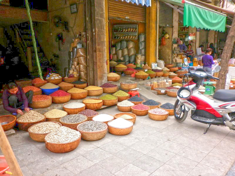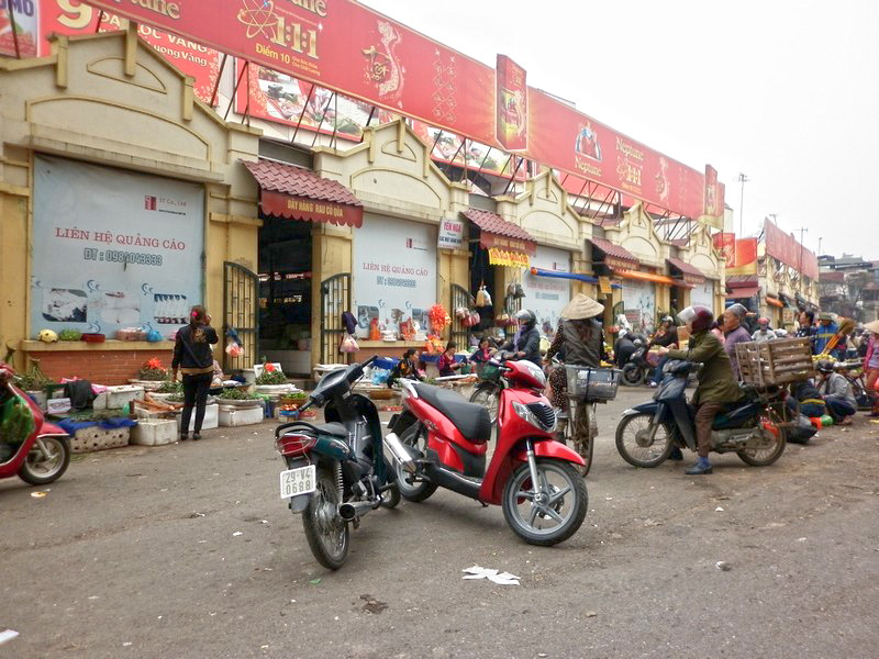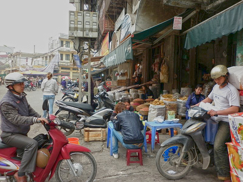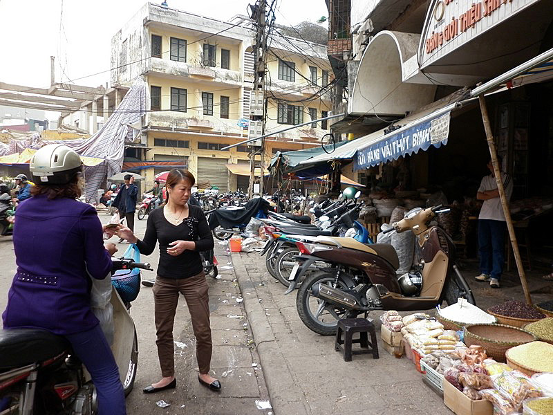 de mieux avec, bien sûr, sur leur carte époustouflante, du chien mais aussi du chameau chinois et des abeilles frites. C’est zarbi dans ce restau. Une ambiance (Andrea dixit) entre gare centrale, karaoké (très apprécié des Vietnamiens) et repas de mariage. Nam n’est pas avec nous, le personnel ne parle que le local, on nous fait comprendre qu’il n’y a pas de chien et nous suggère, ou impose, du boeuf. Ce n’était pas notre meilleur repas, il n’a pas droit à la photo. Après le repas, balade au marché nocturne. Là non plus, pas de photo, c’est à 100% du linge chinois et des fringues. Nous reconnaissons parmi les marques proposées : Chanel, Hermès, Armani... No comment. Le marché est très apprécié et de nombreux Hanoïens s’y rendent, mais c’est dodo pour nous. |