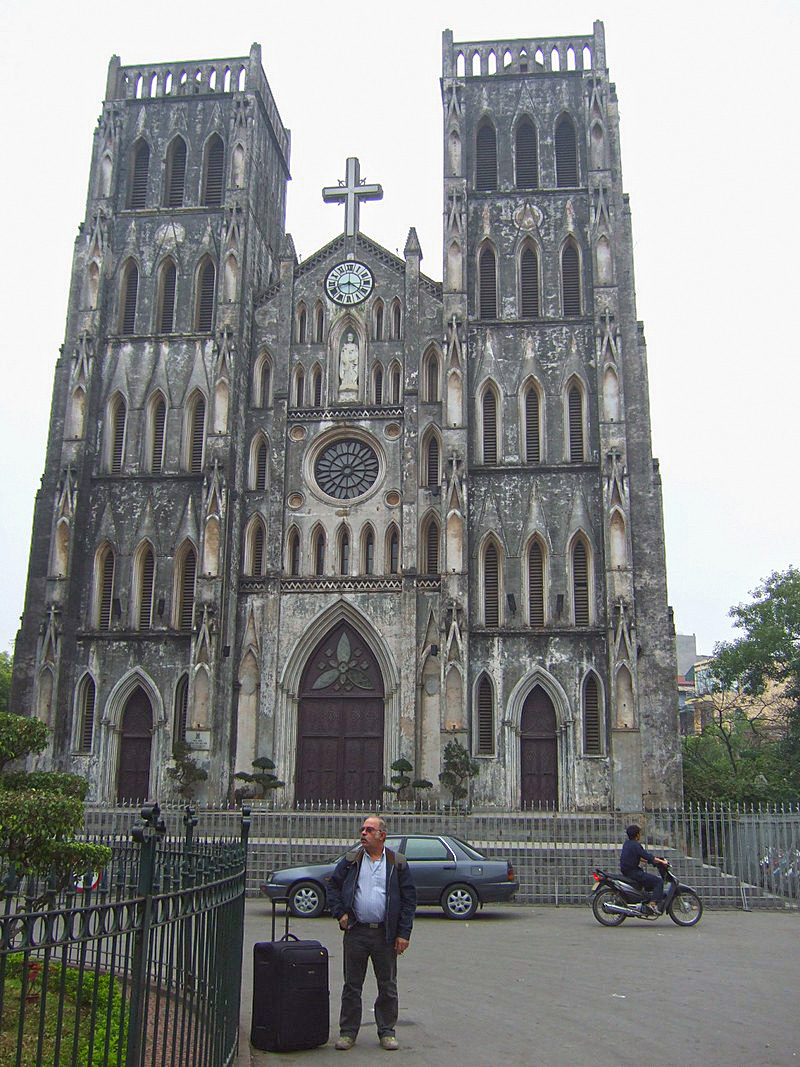 | 1er avril : Hanoï - Langson (env. 150 km) Sur la place de la cathédrale St. Joseph, en attendant Nam, je dois discuter pour empêcher un chauffeur de minibus de charger ma valise avec celles d’autres touristes. |