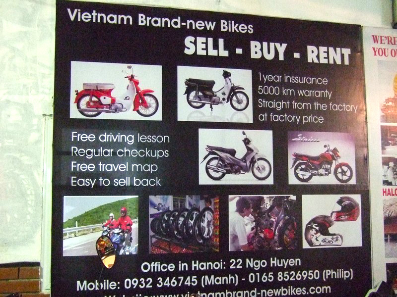| Je reviens aux 2-roues. Comme en Chine, c’est ici le véhicule utilitaire, que tout le monde ne peut pas s’offrir. La bagnole, on n’en parle même pas ! Si j’ai vu dans Hanoï des Bentley, grosses berlines Mercedes, des 4x4 style Audi Q8, Porsche ou Lexus, elles ne sont réservées qu’à quelques rares privilégiés. Sur les routes, on rencontre surtout des camions, quelques berlines japonaises et des 2 roues. Honda a fait un sacré coup avec des cyclos “Wave”, cadre en tôle emboutie, moteur 110 cm3, freins tambour, qui représentent 90 % de ce qui roule. Ce doit être costaud, vu ce qu’ils arrivent à charger dessus ! Photo pub du GCC dans la ruelle de l’hôtel. |