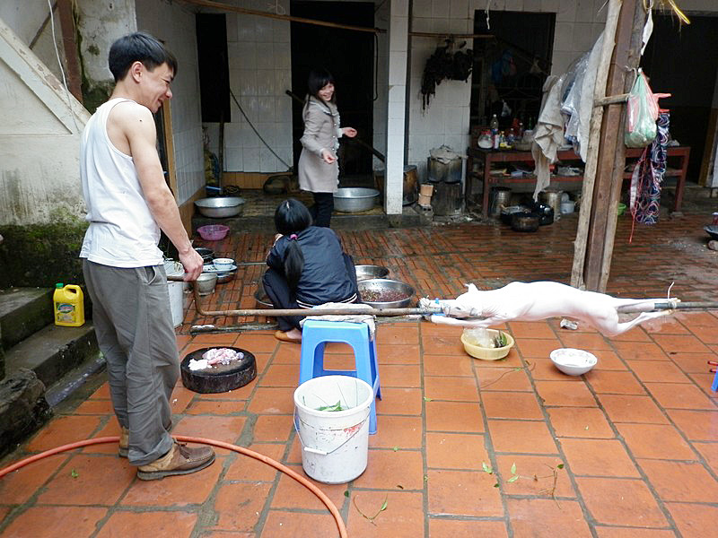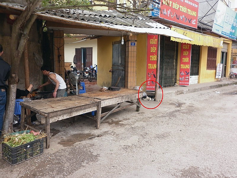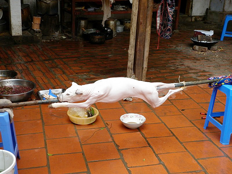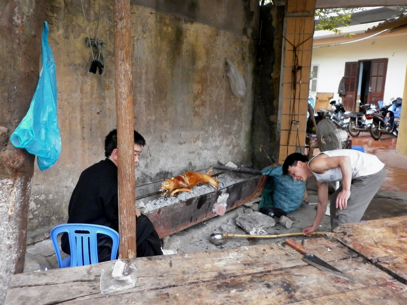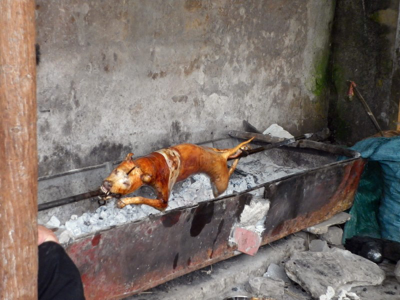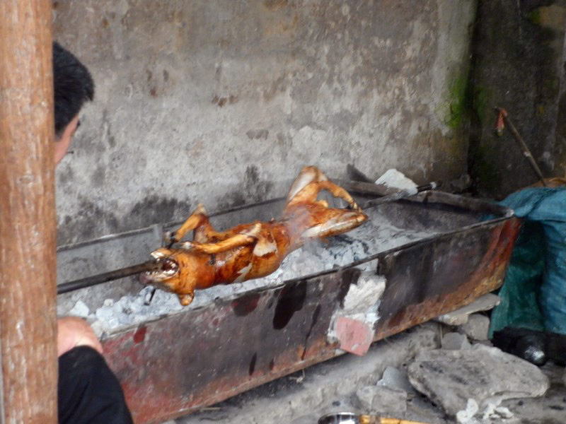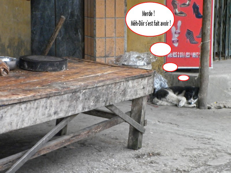 | Allez, les deux dernières... Pour la petite histoire, il existe un antagonisme ancestral entre les habitants du Nord, où nous trouvons, et ceux du Sud. Ceux du Sud trouvent dégoûtant de manger du chien. Eux n’en mangent pas. Par contre, ils mangent du rat, que les habitants du Nord ne mangent pas. Bon, on rentre à l’hôtel. |