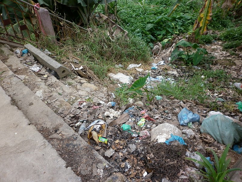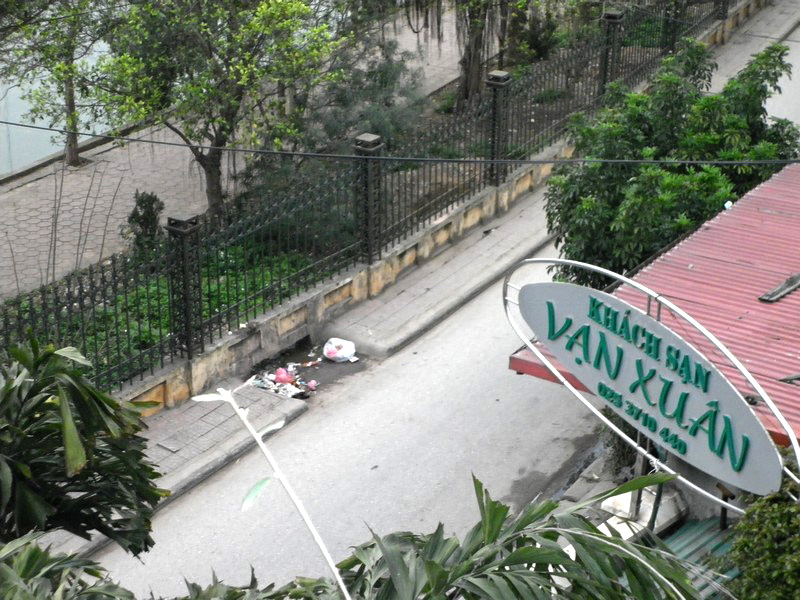 | Nous quittons l’hôtel. Tiens ! La poubelle n’est pas passée... |