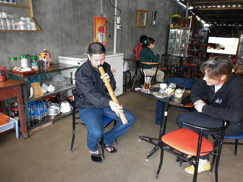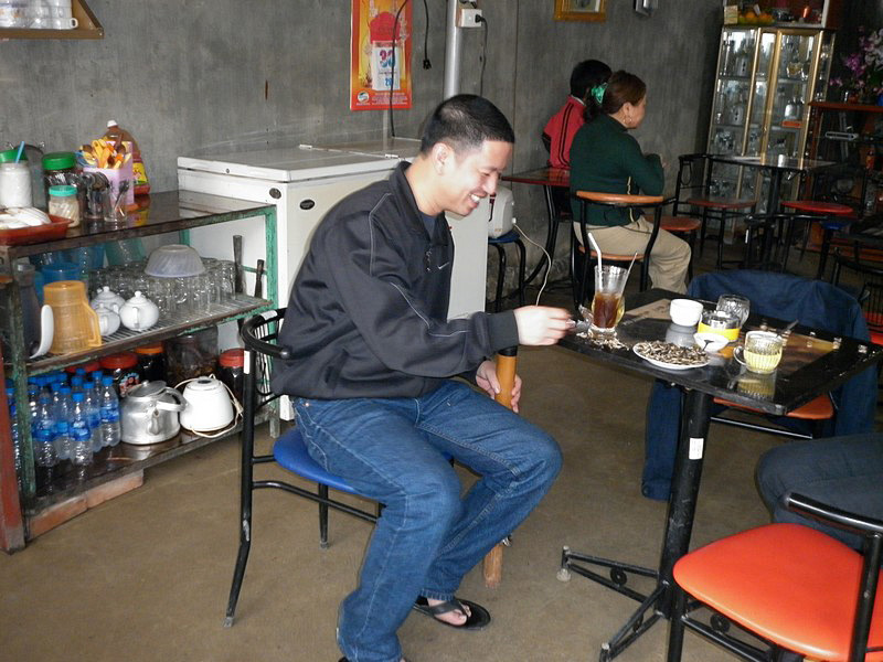 | Nous nous arrêtons pour un café. Il est excellent, Andrea en commande un deuxième en vietnamien. Tout le monde rigole, mais elle obtient son kha-fé. Nam s’offre une petite pipe. |