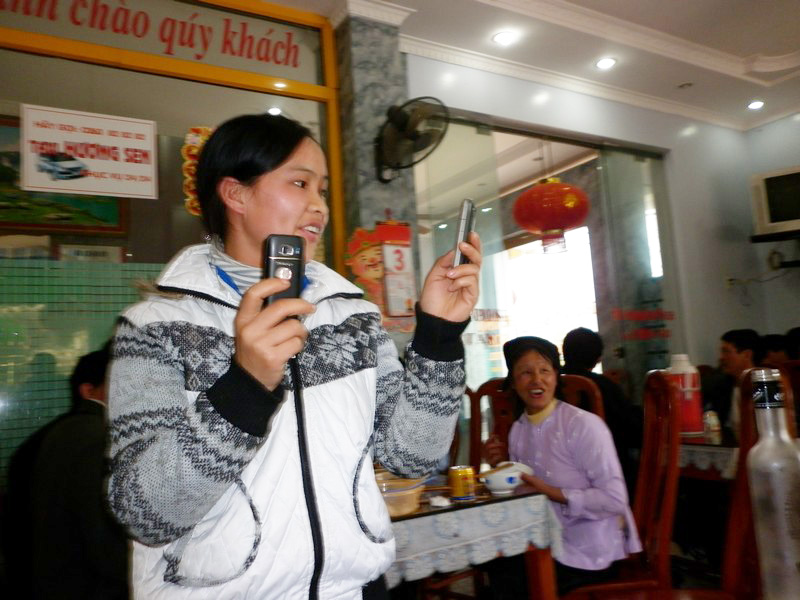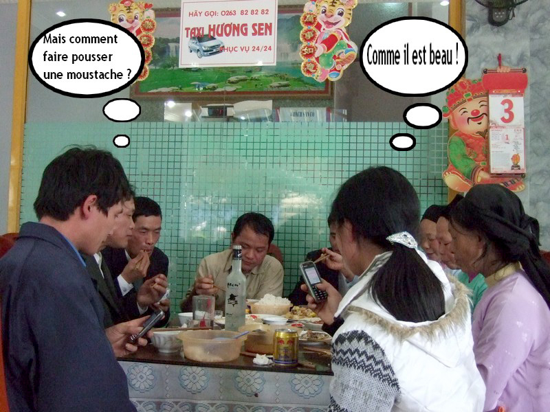 ethnies) casse aussi la croûte et ce sont mes moustaches qui les interpellent ! Une intrépide jeune femme nous mitraille de ses téléphones. |