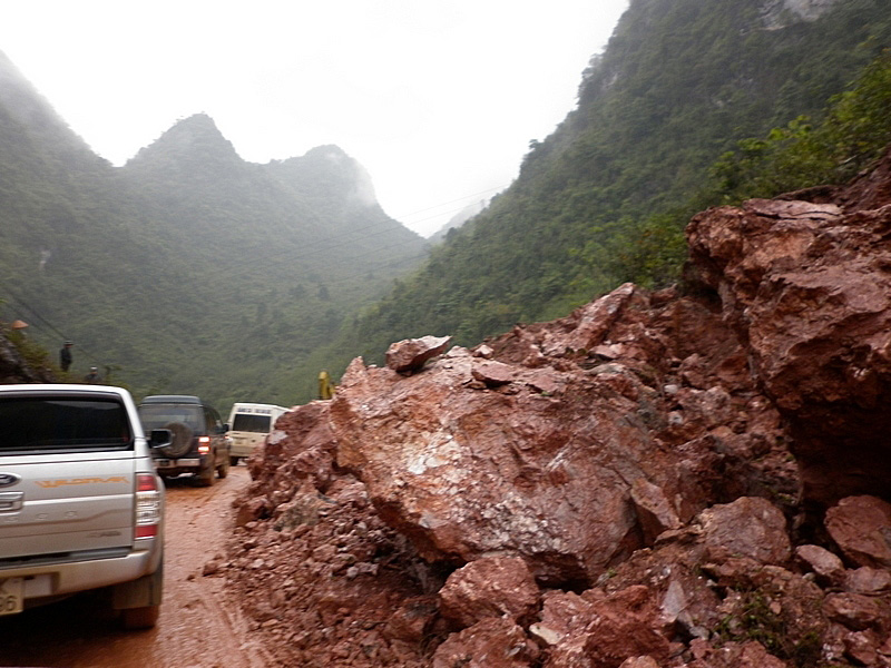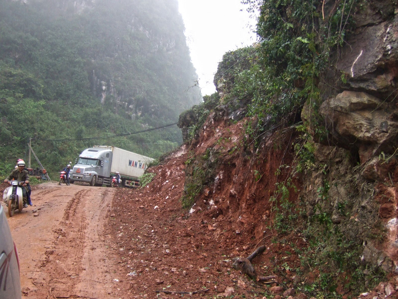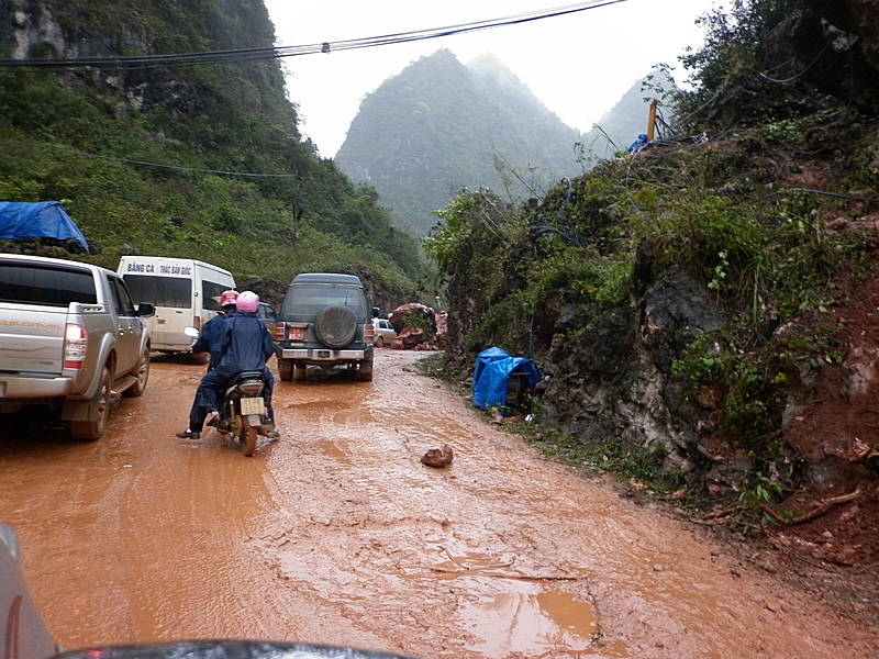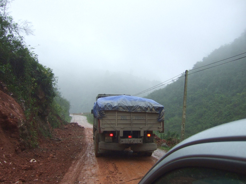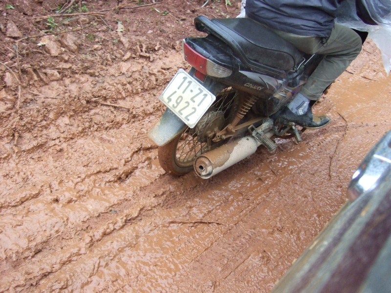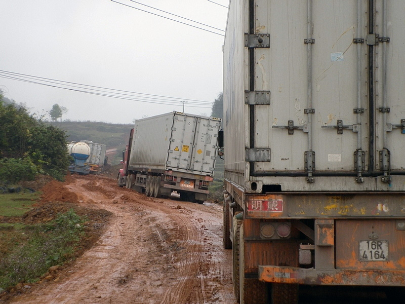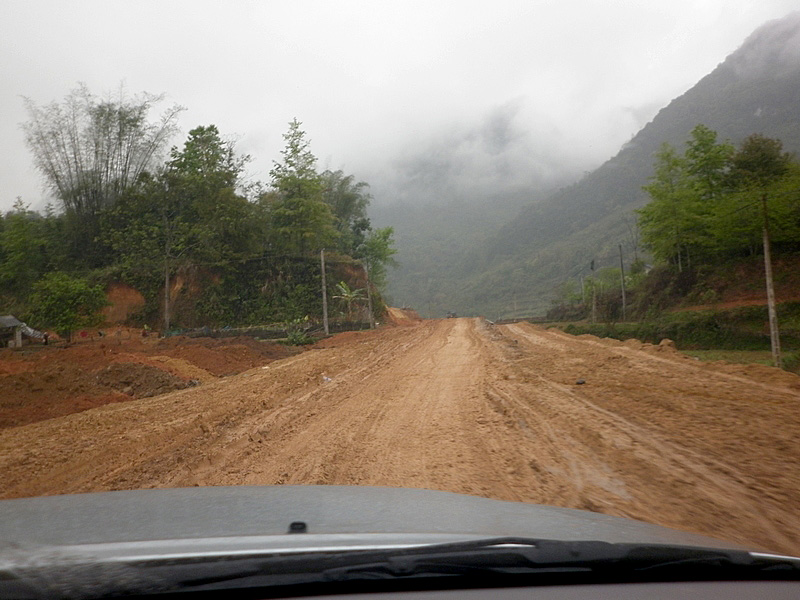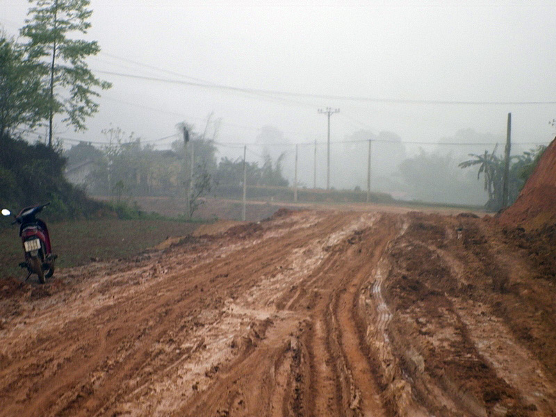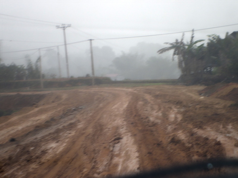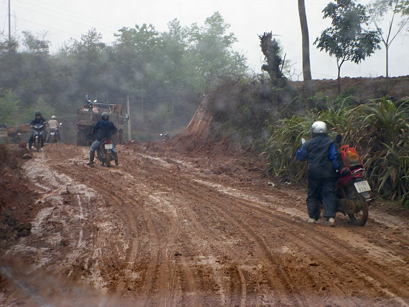 piéton à la semi-remorque, roule dessus. Nous n’avons vu que de la piste de glaise. Nulle part, ce n’est stabilisé. D’après Nam, il faudra encore attendre plusieurs années avant que ces chantiers ne soient terminés. Et quand il pleut (et il pleut souvent) les camions défoncent tout et tout le monde se plante ! |