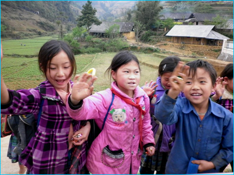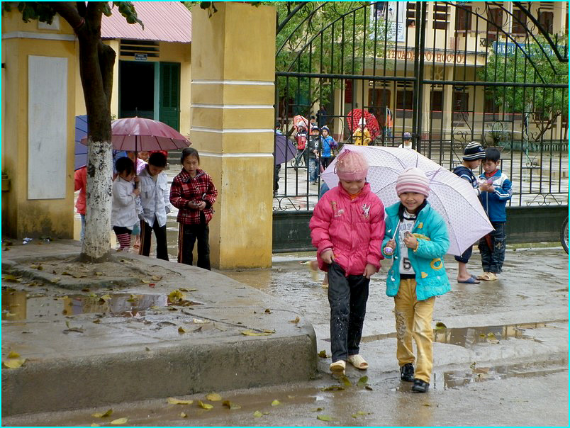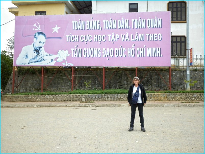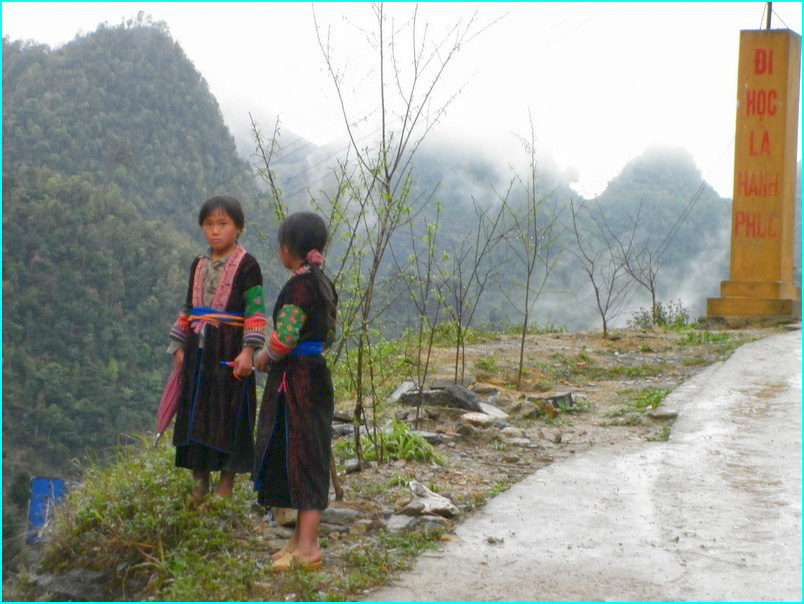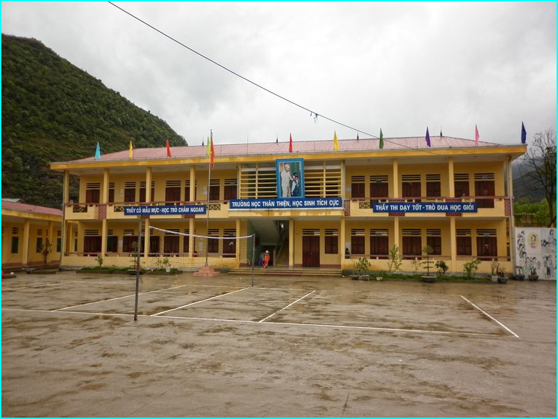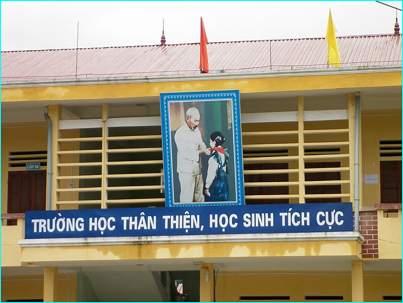 | Sur le fronton de chaque école, on voit l’oncle Hô remettant le Foulard du Mérite à une petite fille. | ![]() |
