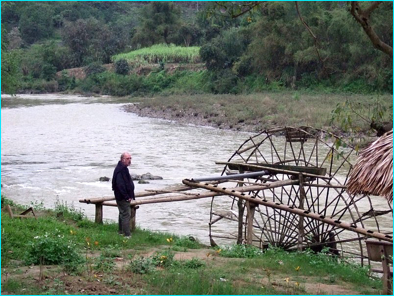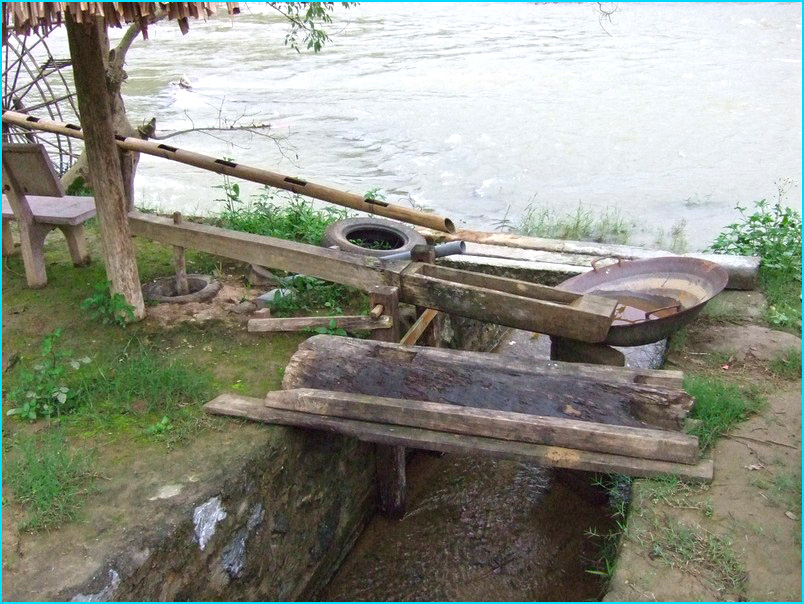 | Au bord du fleuve, il y a un truc intéressant : une roue à eau déverse dans un tube, de bambou bien sûr. | |