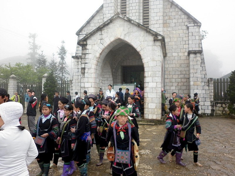 | Nous traversons le marché. Un homme propose à la vente un pauvre épervier. Le piège lui a sectionné une patte, qui ne tient plus que par un lambeau de tendon. Ce soir, il sera bouffé. Je suis triste de voir ça et ne fais pas de photo. C’est la sortie de la messe. |