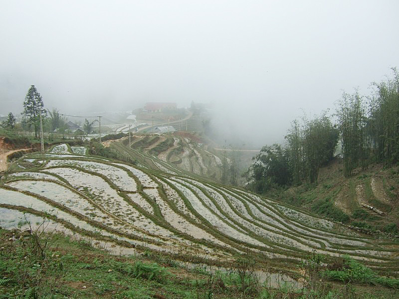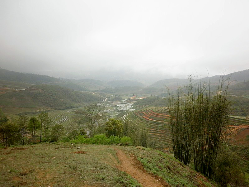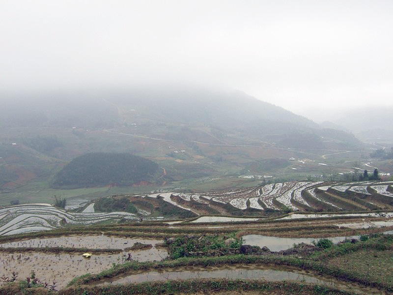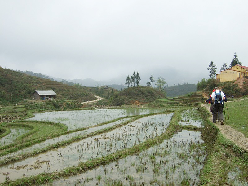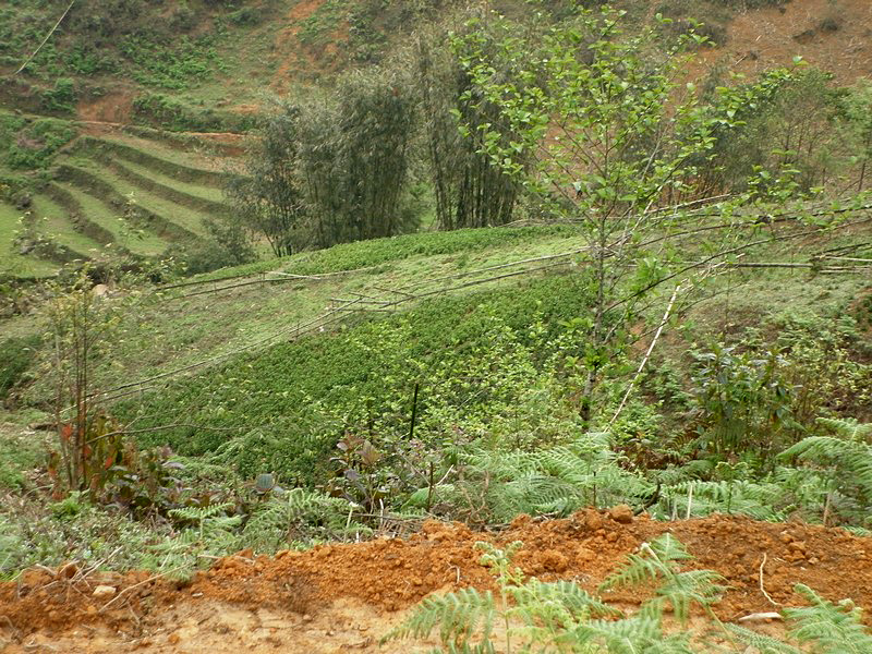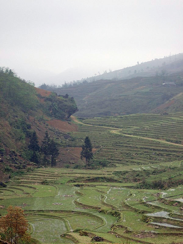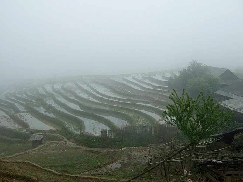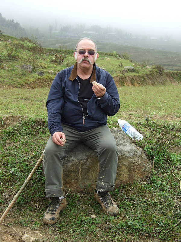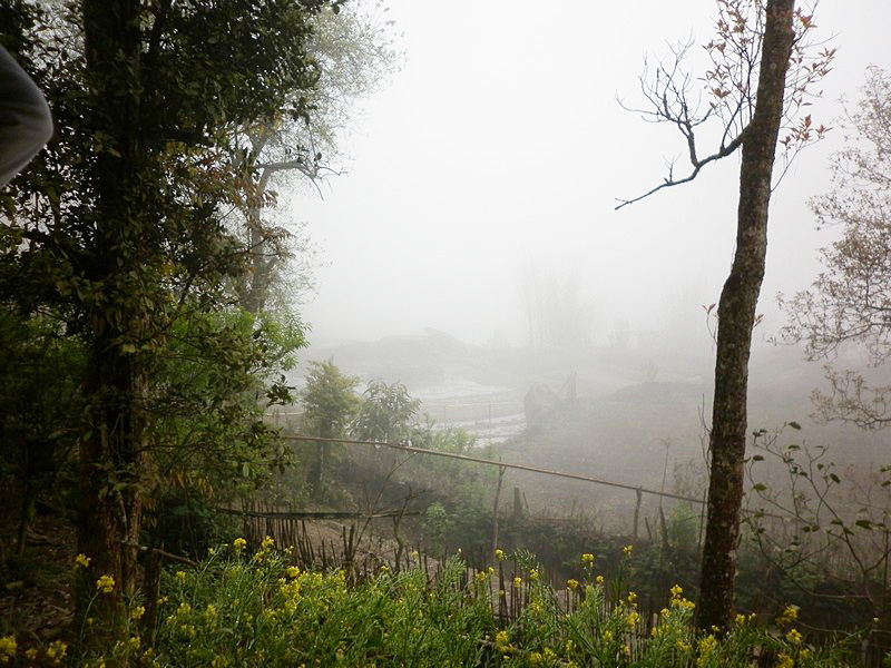 Pas seulement de la région puisqu’il a épousé la gentille Xi Quan, qui sera notre guide pour cette randonnée. Olivier parle le vietnamien et plusieurs langages locaux ! Il est convenu que nous nous rendrons (à pied) à Ta Phin, où nous serons hébergés chez la famille de Xi Quan. Philippe, sympathique touriste belge, est également de cette randonnée. Xi Quan se prononce “scie couenne”. C’est parti. Bien entendu, bruine délicate et brouillard vaporeux. |