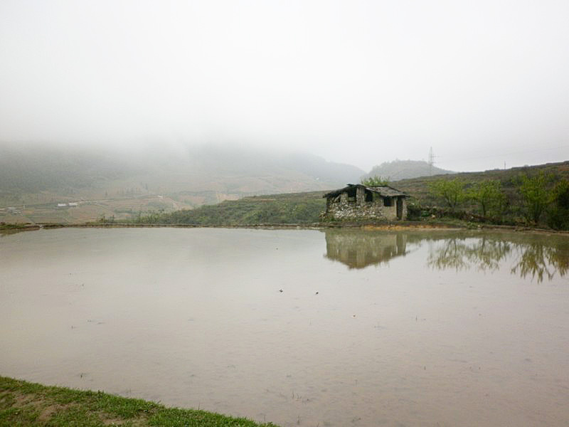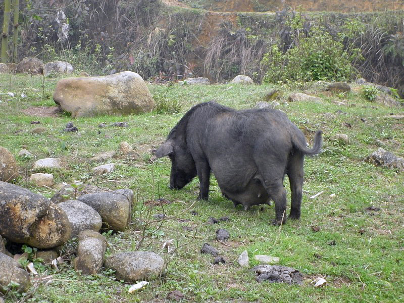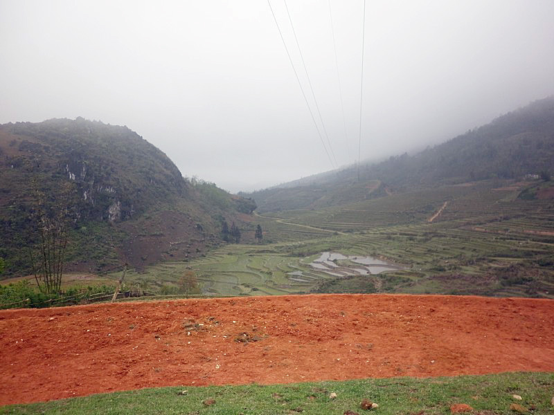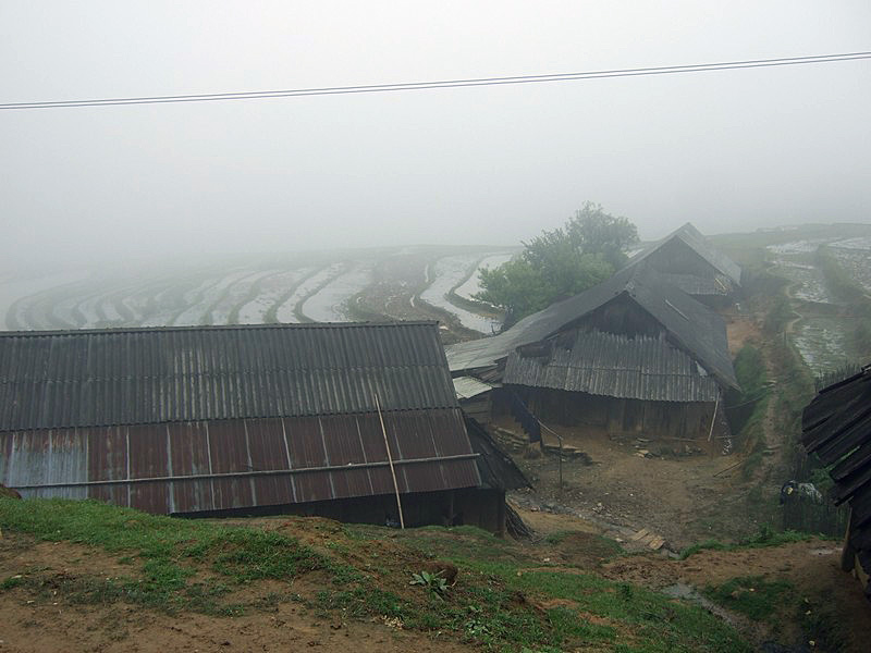 | Avertissement : j’avais décidé de ne plus insérer de photos de rizière, ou de boue. Là, c’est pas possible ! Mais pour compenser, j’ai mis des buffles et des cochons ! Dorénavant, plus de voitures : ce ne sera que du chemin ou pire ! Les images sont dans l’ordre. À remarquer les caprices du brouillard. |