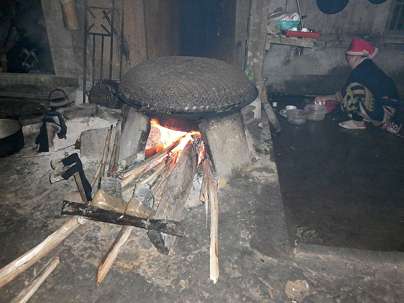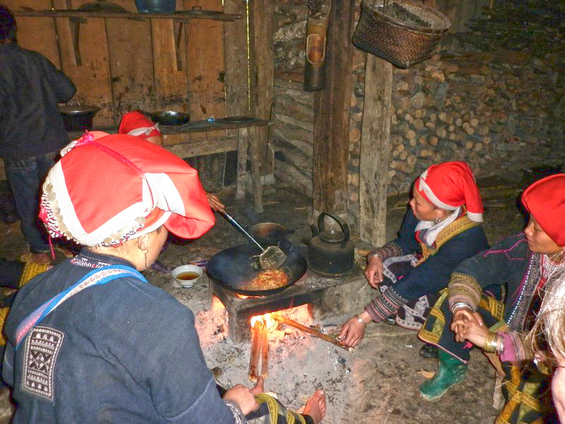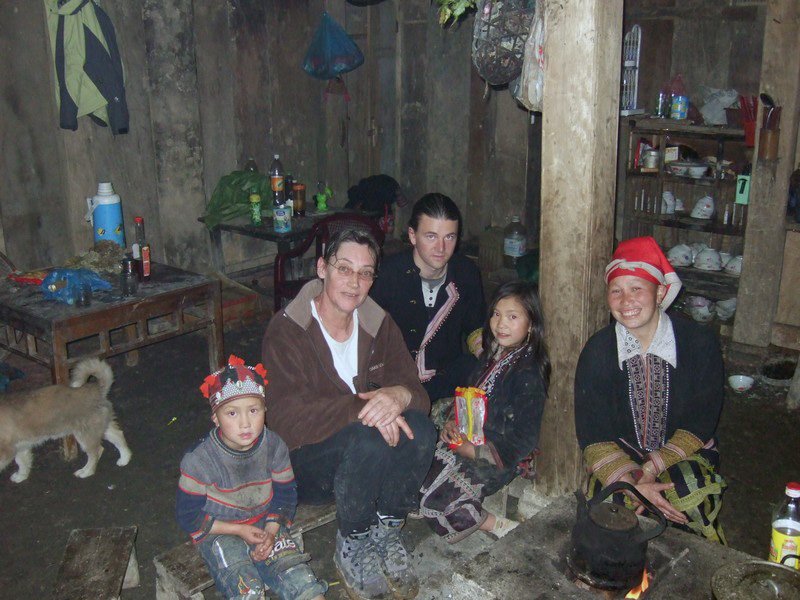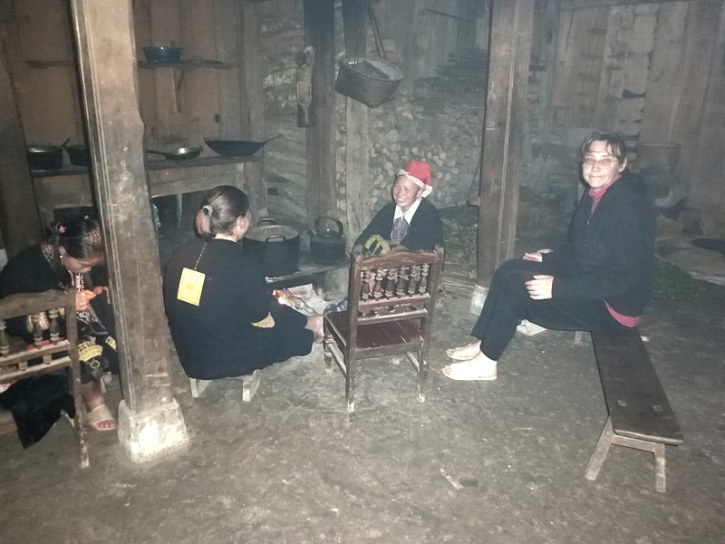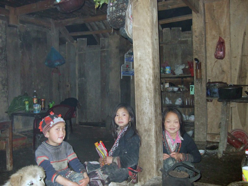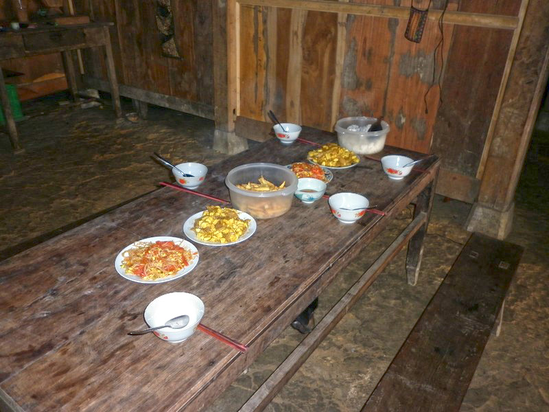| On se sent bien dans cette maison. Olivier nous a fait goûter de son alcool de riz en précisant que la règle veut que l’on ne mange pas de riz tant que l’on boit l’alcool. Le repas est succulent, nous reprenons des forces, surtout moi qui suis arrivé moins fier qu’au départ. Le repas terminé, Olivier et Xi Quan nous proposent de nous faire visiter leur maison, qui se trouve à 30 mn de marche (et ça monte, a-t-il précisé). Avec ce que j’ai bavé aujourd’hui, je joue les lopettes et déclare que je n’irai pas, je vais garder le campement. Le groupe des 4 courageux se met donc en marche. La pente est raide, le chemin glissant et après plus d’une demi-heure de crapahut, arrive à la maison où attendaient (depuis 2 jours) les 3 enfants de Xi Quan. |