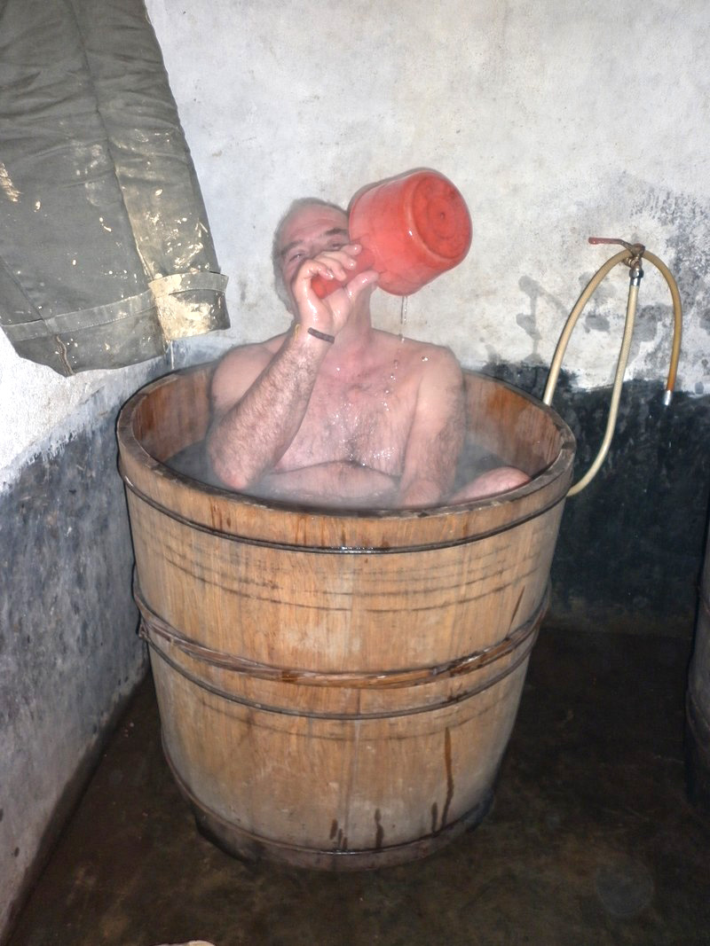 | Maintenant, je sais ce qu’est prendre un bain dans une théière ! Chacun son baquet, baignant dans ce chaud mélange vert et odorant qui réchauffe et revigore. Si nous n’avions pas dû céder la place à Philippe au bout d’une demi-heure, j’y serais encore ! |