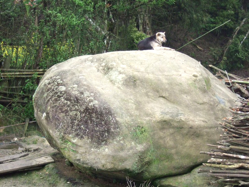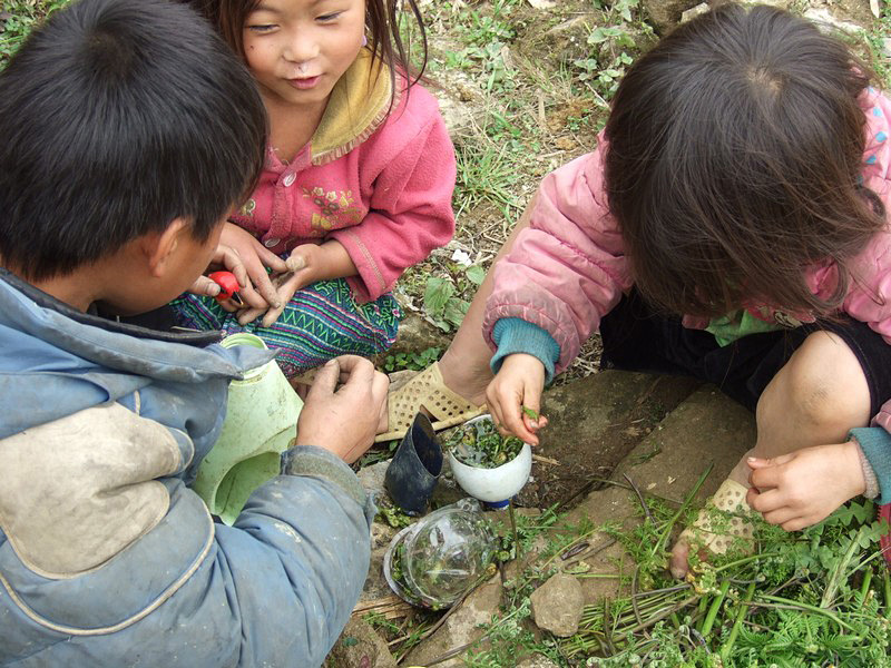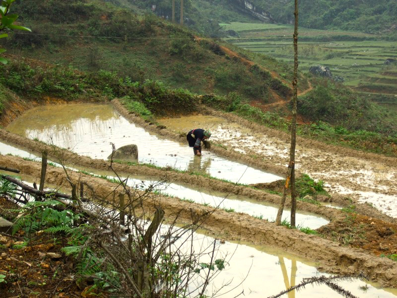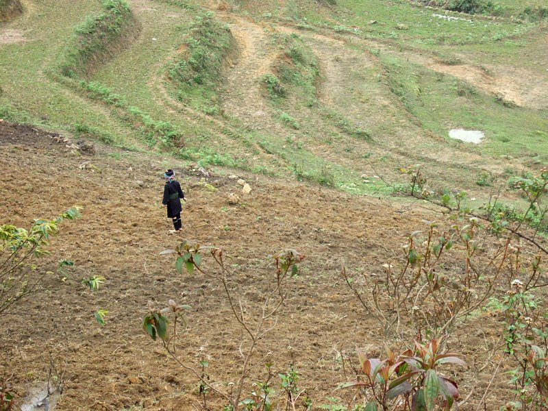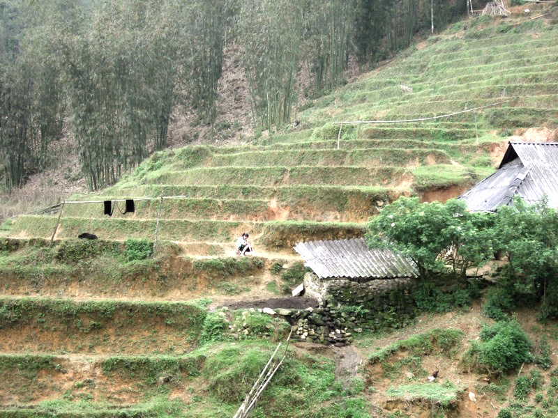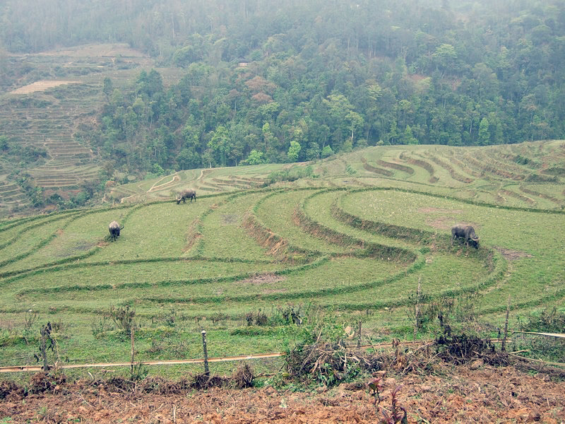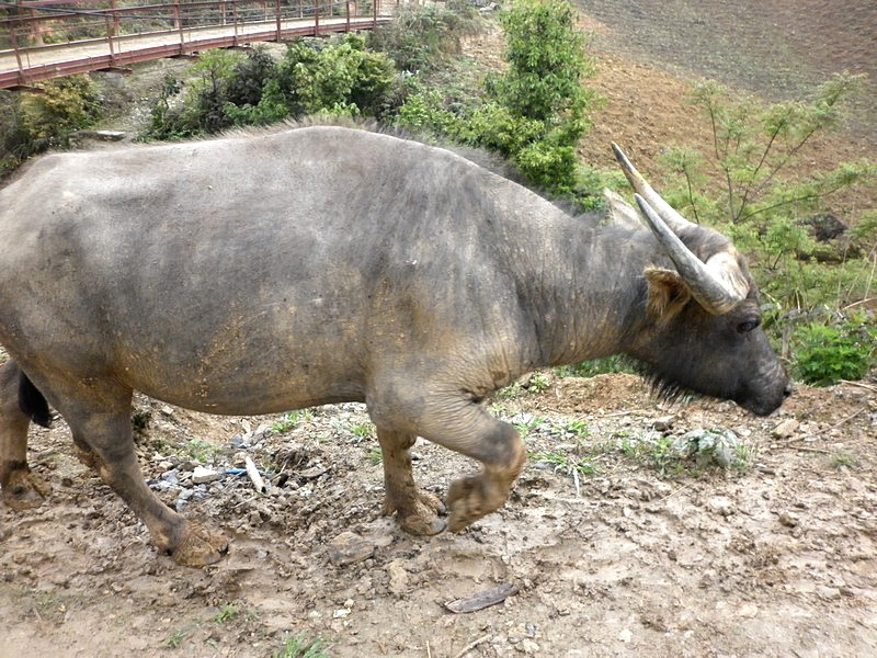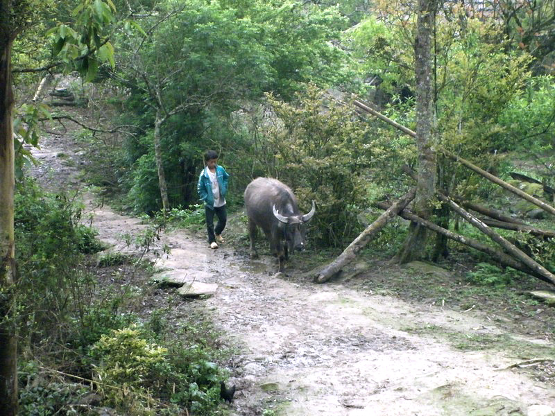 | Le garçon a sorti son buffle. Un buffle, c’est un trésor. L’hiver dernier, il a fait très froid. Il a même neigé et beaucoup de buffles sont morts. Actuellement, ils sont encore fatigués et ne peuvent fournir qu’un travail limité. Que deviendront ces gens s’ils ne peuvent labourer, donc récolter le riz ? Dans ces montagnes, il n’y a qu’une récolte annuelle, contre 2 à 3 dans le Sud. |