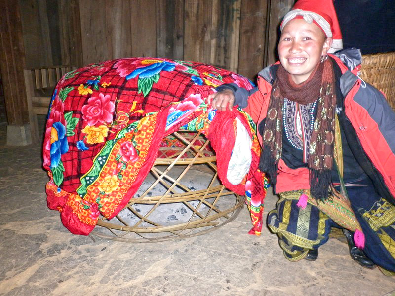 | Xi Quan nous présente le sèche-linge. Sous le panier qui supporte le linge à sécher, des braises sont introduites et le tour est joué ! Si on avait su, on aurait apporté le jean d’Andrea !!! |